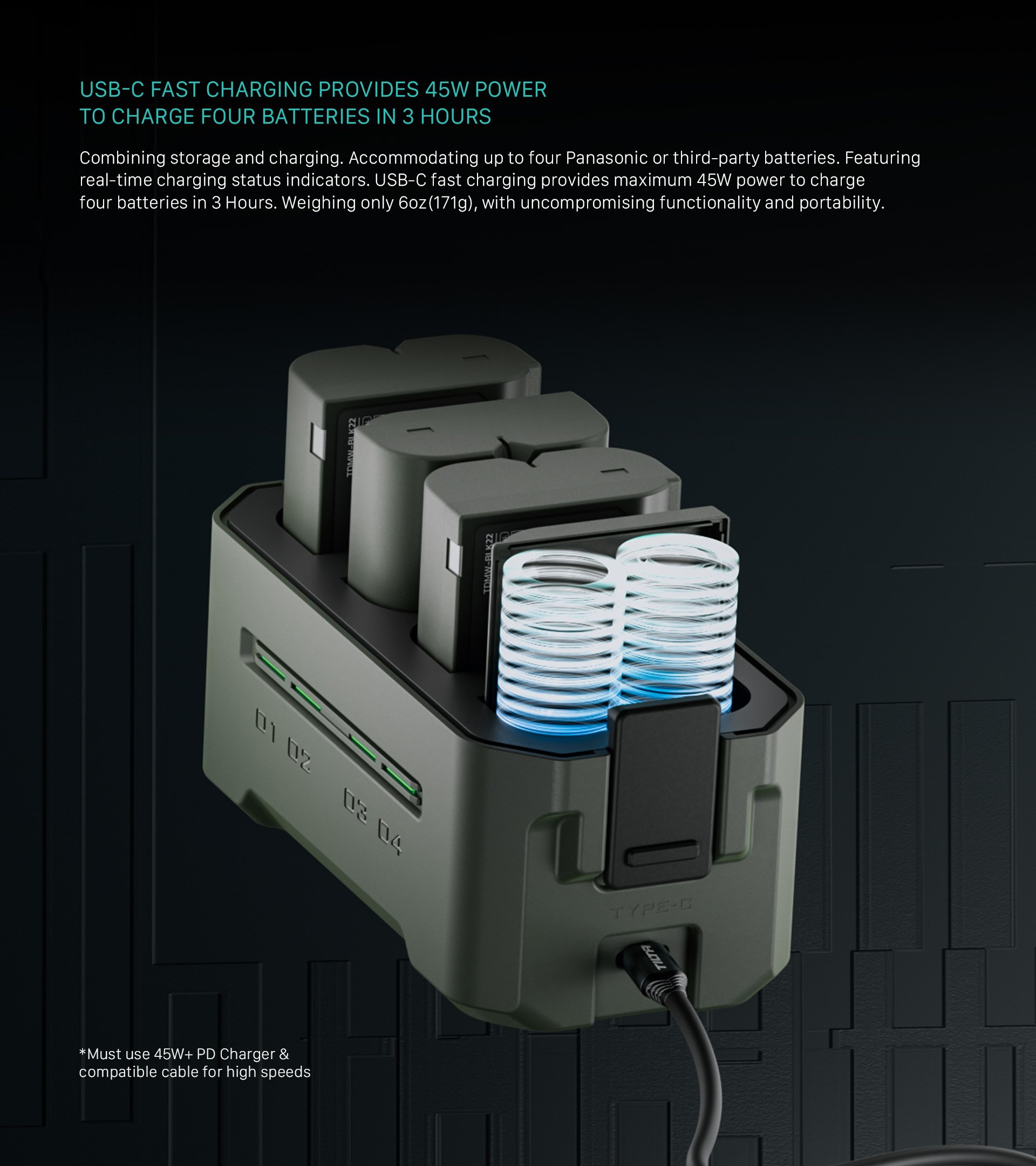 • USB-C FAST CHARGING Provides 45W Power to Charge Four Batteries in 3 Hours