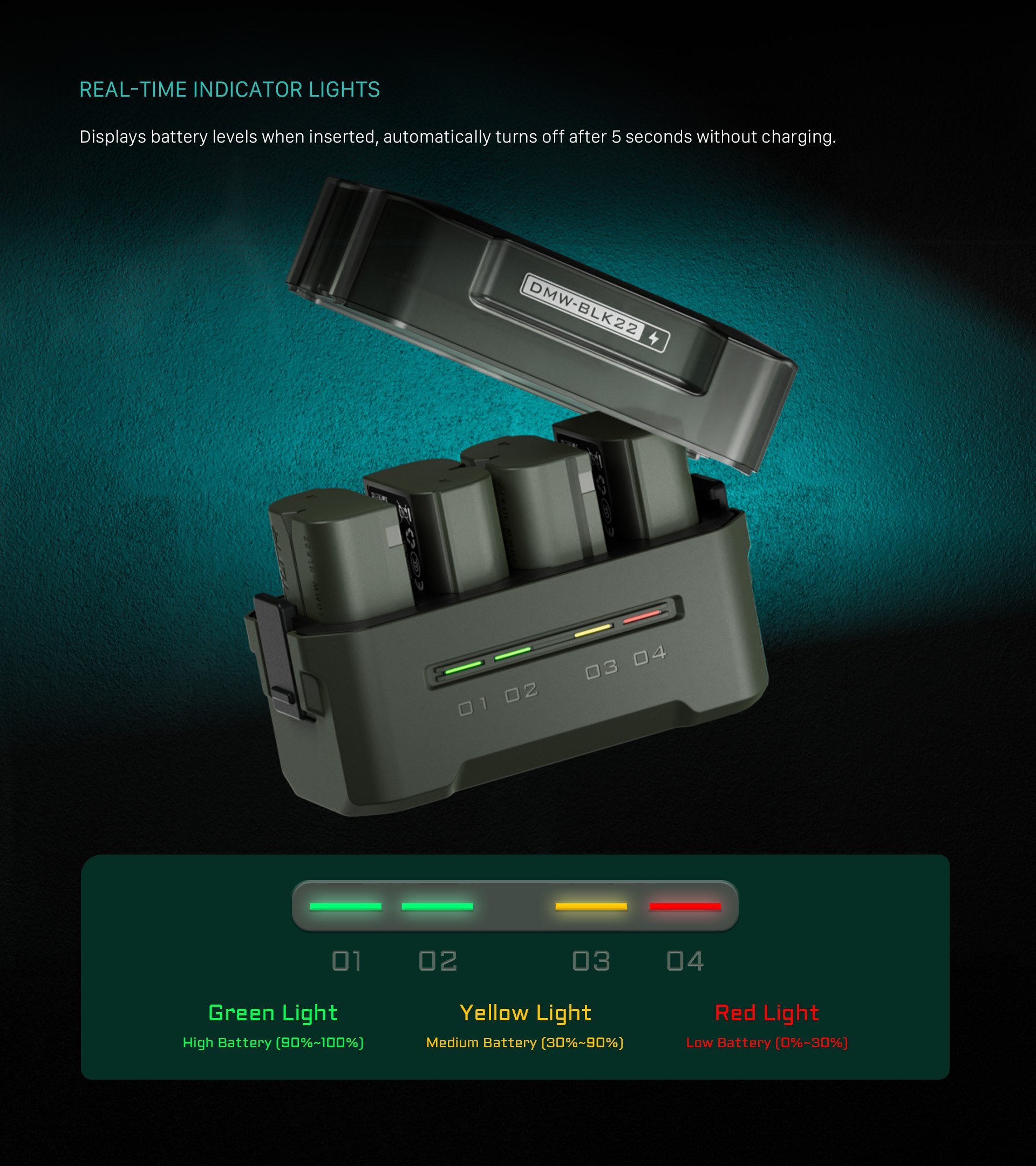 • STATUS INDICATORS Show Real Time Charging Information for Each Battery Slot