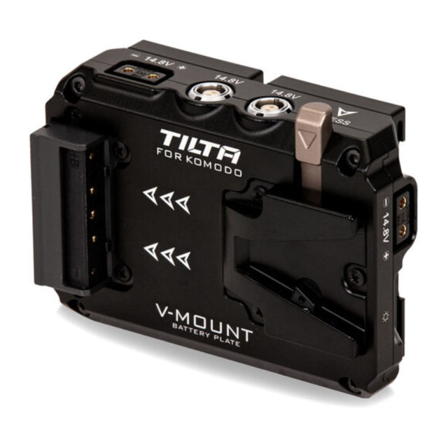 Tilta's Dual Canon BP to V-Mount Battery Plate Adapter, in black, is designed to attach to the dual Canon BP battery mount on the RED Komodo camera. It provides a V-mount battery plate on the other side for attaching V-mount batteries for extended runtimes.