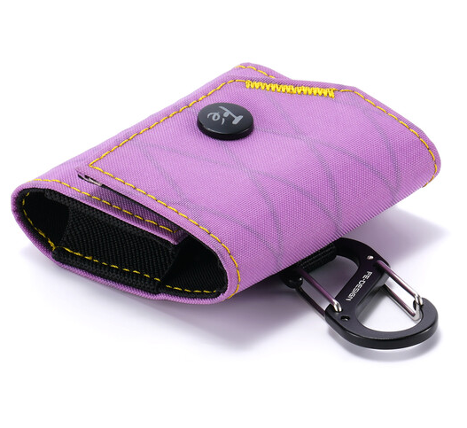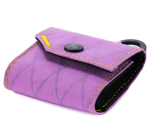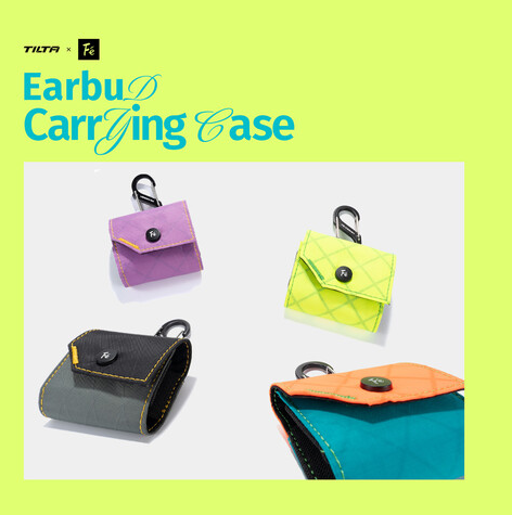 The Tilta TF-EEC-P FE Ecopack EPX200 Earbud Carrying Case in purple is a compact, eco-friendly solution for carrying earbuds and small accessories. Made from recyclable, UV-resistant materials, it features a magnetic snap closure and a spring-loaded aluminum S-hook carabiner for secure, versatile attachment to belts, bags or keyrings.