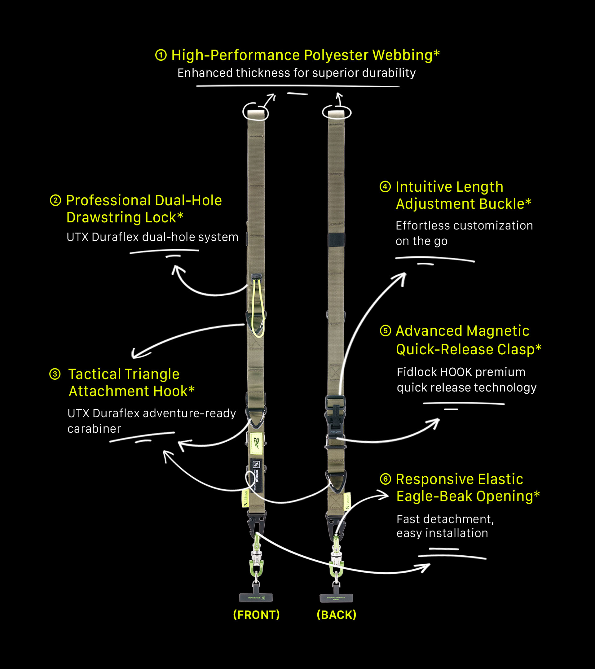 This Shoulder Strap is constructed from High-Performance Polyester Webbing for Enhanced thickness for superior durability. It features a Professional UTX Duraflex Dual Drawstring Lock system for improved security and tactical UTX Duraflex Carabiners allow this strap to connect to a variety of cameras, accessories and more.
