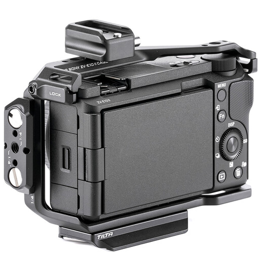 The Tilta TA-T69-FCC-B Full Camera Cage (Black) is a lightweight, modular aluminum armor system tailor-made for the Sony ZV-E10 II, delivering complete protection with full port access, a built-in silicone handgrip, top/side cold shoe and NATO rail, multiple anti-twist 1/4"-20 & 3/8"-16 threads, Arca-Swiss + DJI RS gimbal-compatible base and removable side/top plates – all at just 94 g for the ultimate vlogging rig.