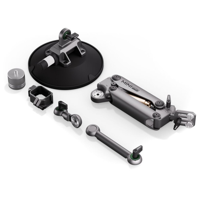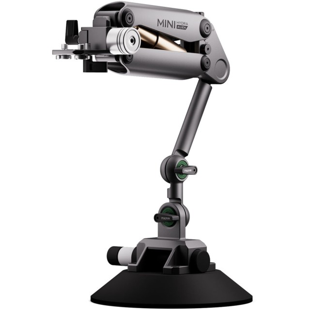 Capture smooth traveling shots using your action camera and the titanium gray Hydra Alien Mini Car Mount Kit from Tilta. This compact, lightweight car mount uses a shock-absorbing arm to support your camera on a car or another vehicle. It includes a 6" suction cup mount, an extender support arm, a counterweight, and a soft carrying case.