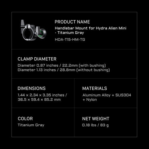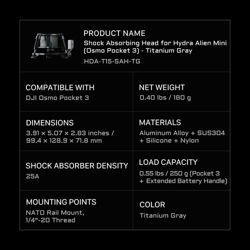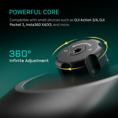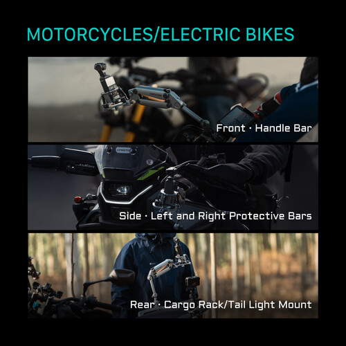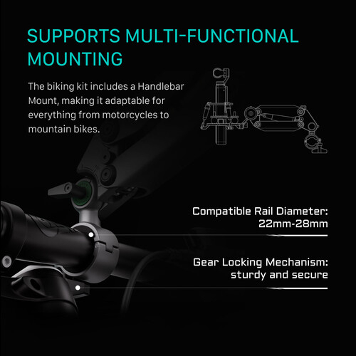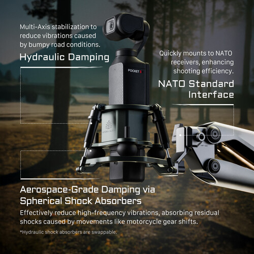 The multi-axis Hydra™ stabilization platform further isolates high-frequency vibrations, ensuring smooth footage even on rough terrain. The shock-absorbing head is optimized for DJI Osmo Pocket 3, while the handlebar mount supports diameters of 22.2mm and 28.8mm, making it adaptable to different vehicle types.