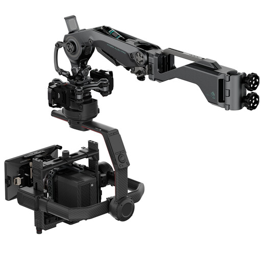 Designed for professional gimbal setups, the arm supports heavy, medium, and light payloads ranging from 15.4 lb to 28.7 lb, accommodating rigs like DJI Ronin 2, RS 4 Pro, Ronin 4D, and MōVI Pro. Multiple 1/4"-20 and 3/8"-16 accessory threads allow flexible mounting options. The built-in OLED touchscreen display provides real-time control over damping, payload mode, and battery levels. The shock-absorbing head features swappable shock absorbers to reduce high-frequency vibration and includes a Manfrotto-style quick release plate for easy gimbal attachment.
