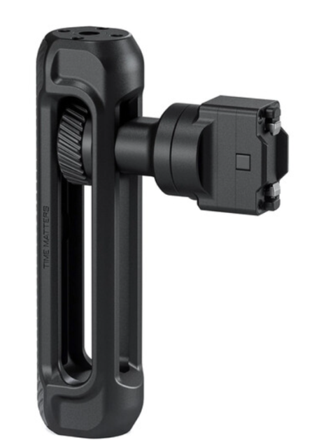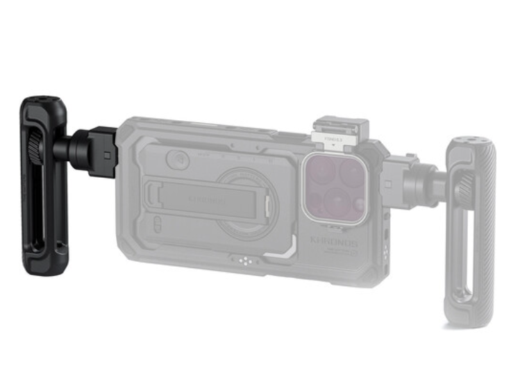 The Tilta TK-AH-B Khronos Adjustable Handle is a versatile side handle for the Tilta Khronos cage, offering 2.1" height adjustment, 180° rotation in five steps and 1/4"-20 mounting threads for accessories. Its comfortable silicone grip ensures a secure hold for handheld iPhone rigs.