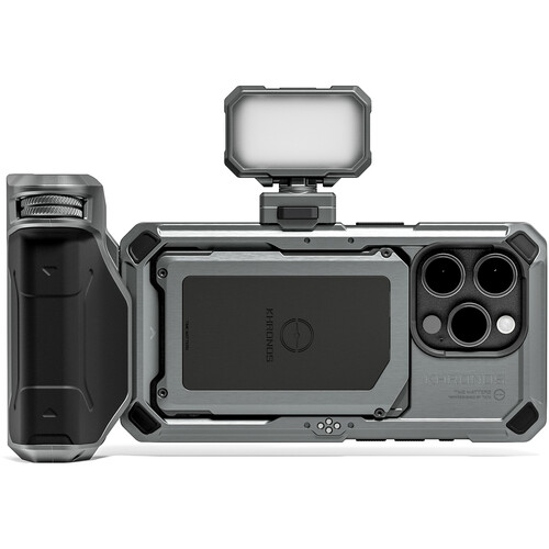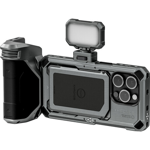 The Tilta Khronos iPhone 15 Pro Basic Kit in Space Gray with battery is crafted specifically for mobile filmmaking enthusiasts. It features the Khronos iPhone 15 Pro Case, providing a secure fit and compatibility with the Khronos Accessory Ecosystem. The kit includes the Khronos Focus PD Handle for enhanced stability and control, along with the Khronos Mini Daylight LED Light, offering three brightness levels and a high CRI of 95 for accurate color reproduction. With its adjustable tilt and horizontal rotation, filmmakers gain precise control over framing and composition. The integrated battery supports USB-C charging, ensuring prolonged usability without interruptions.