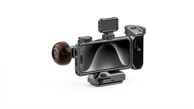 The Handle connects to an iPhone 15 via an integrated USB-C cable and uses bluetooth to control focus or zoom via the dial on the front of the handle. This also provides more stability when operating the system and the record button ensures users do not need let go of the handle to start recording.