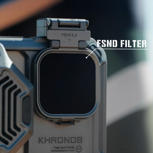 The Filter Tray easily mounts to the Khronos Case via a secure magnetic connection and features a swivel mount that allows the tray to drop into place over all three lenses of the iPhone 16 Pro/Pro Max.