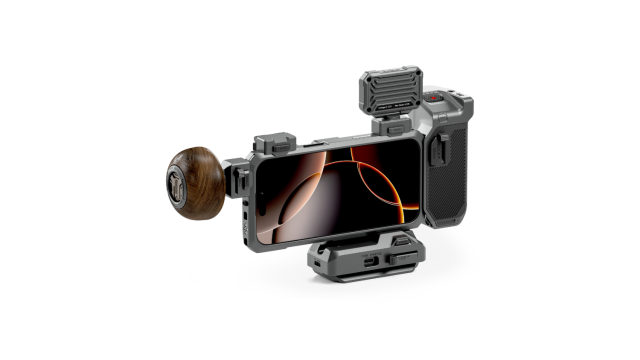 The Handle connects to an iPhone 16 via an integrated USB-C cable and uses bluetooth to control focus or zoom via the dial on the front of the handle. This also provides more stability when operating the system and the record button ensures users do not need to let go of the handle to start recording.