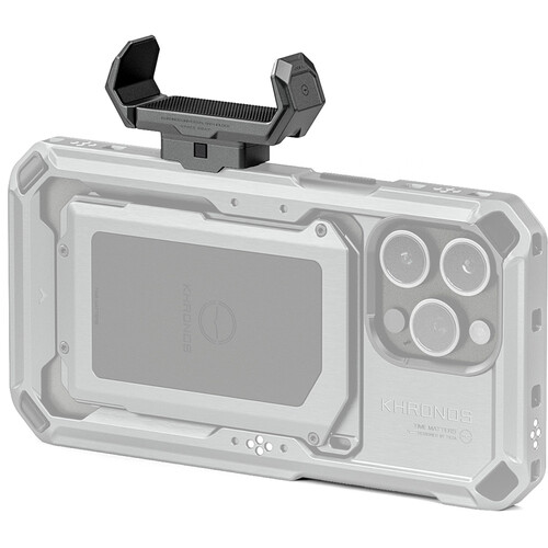 The Tilta Khronos Universal SSD Holder in Space Gray enables you to conveniently mount an external SSD or other accessory to the Khronos Case for iPhone, compatible with the iPhone 15 Pro or Pro Max. It accommodates devices ranging from 1.96 to 2.75 inches wide and up to 0.59 inches tall.