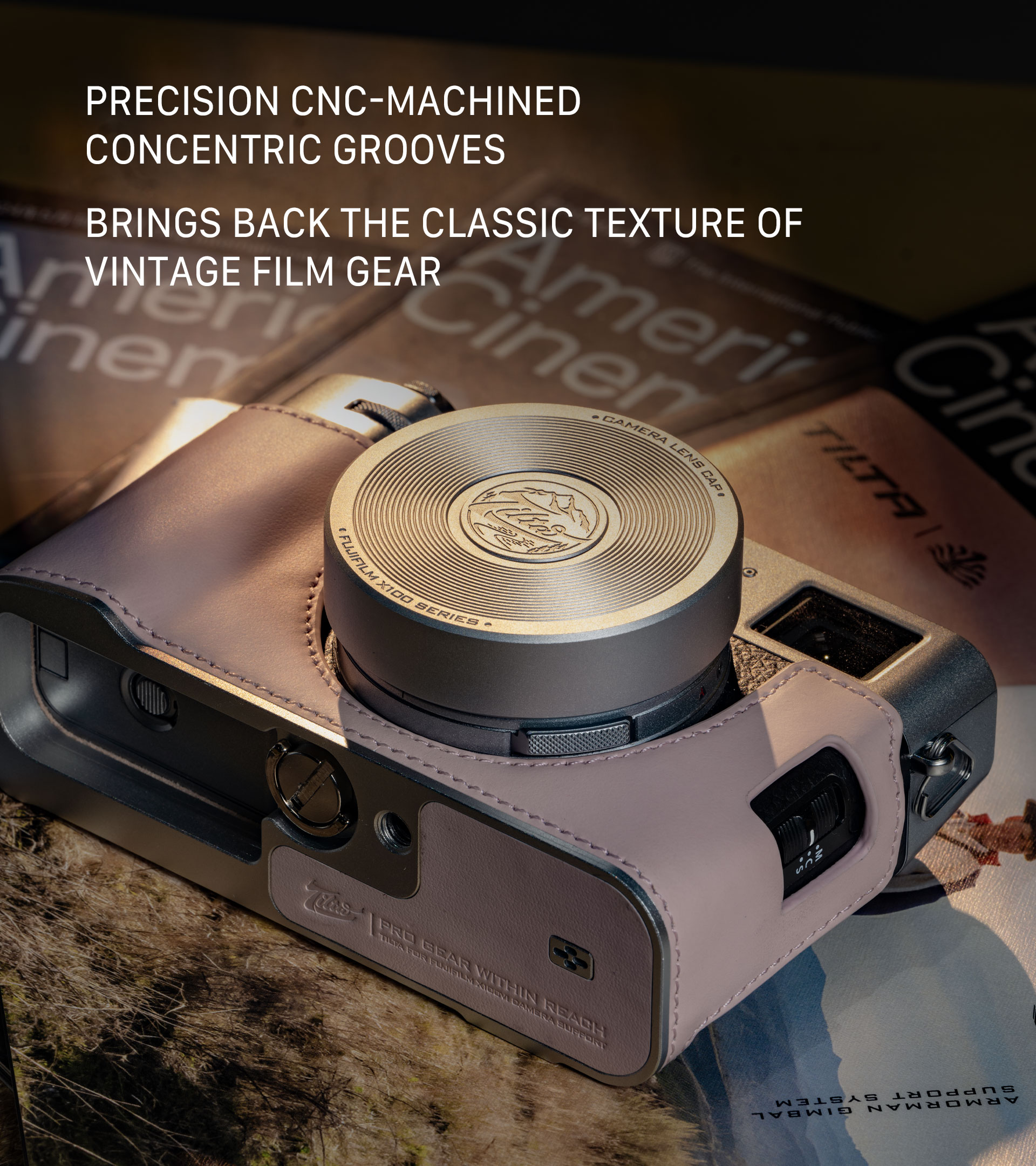 Crafted with precision CNC machining, this lens cap features finely detailed concentric grooves that offer a tactile, textured feel, evoking the classic elegance of vintage film cameras.