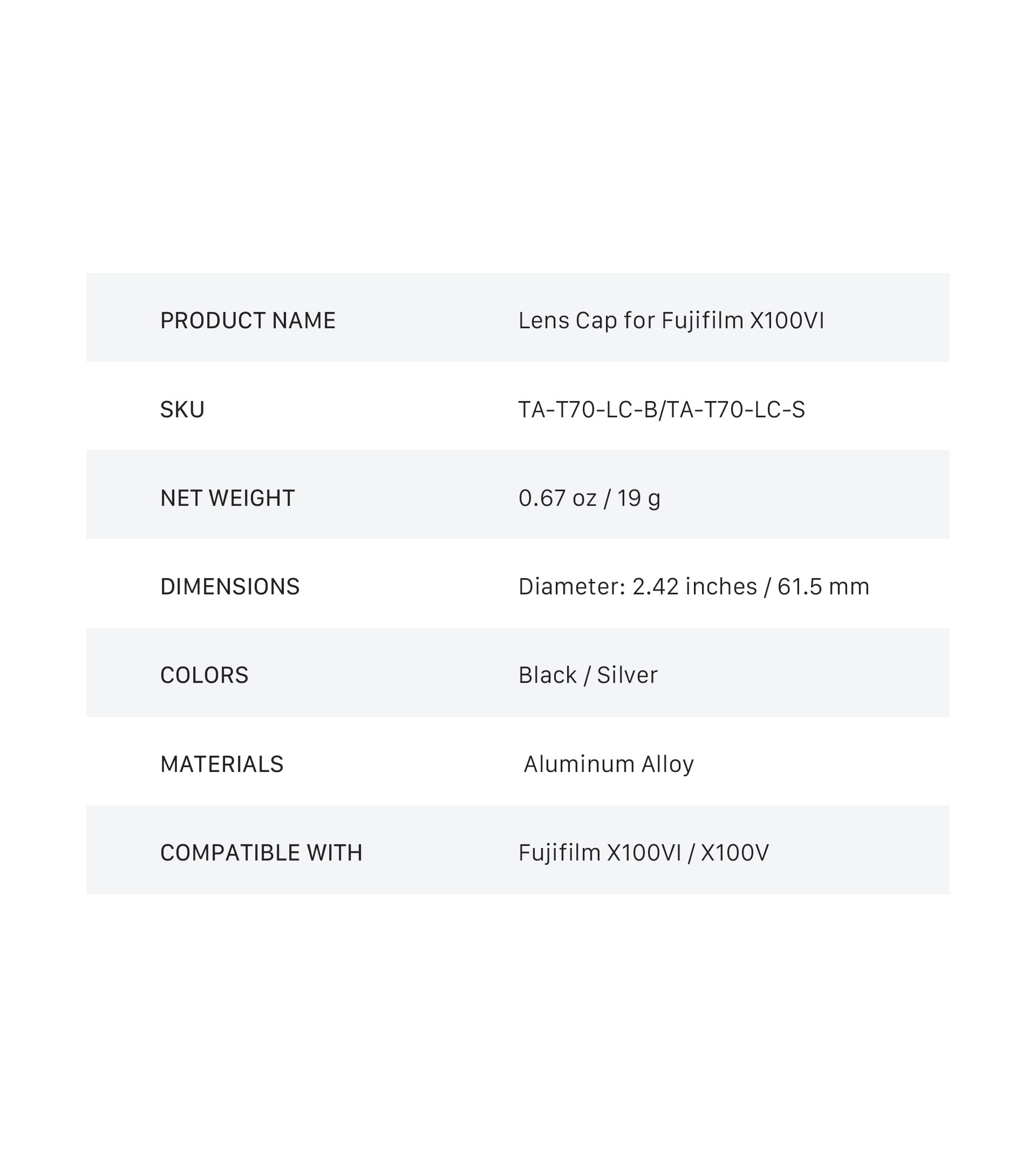 Protect your Fujifilm X100VI or X100V in style with our premium Lens Cap, where modern craftsmanship meets vintage charm. Weighing just 0.67oz (19g), this lightweight yet durable cap is designed to seamlessly fit and protect your camera’s lens.