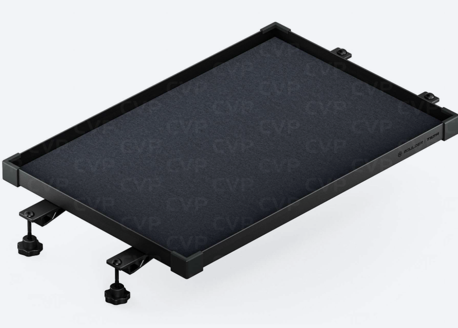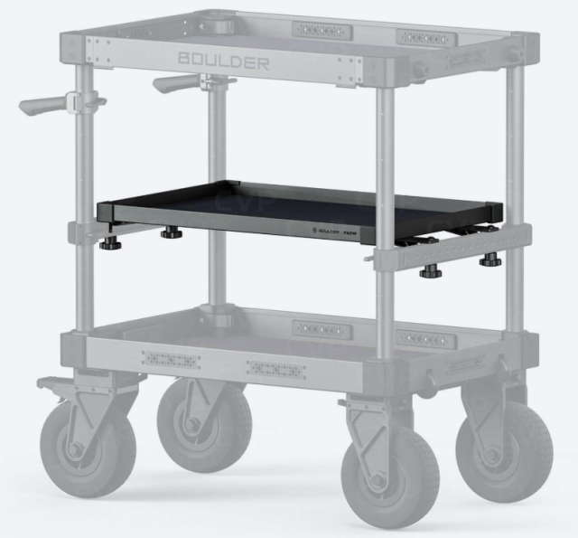 The Tilta TC-MLT-B Mid-Level Tray (Black) is a sturdy aluminum shelf that quickly mounts between the lower frame rails of any Boulder Camera Cart, adding a convenient intermediate-level platform for storing batteries, mags, tools or monitors while keeping the main top tray clear and the bottom area open for larger cases.