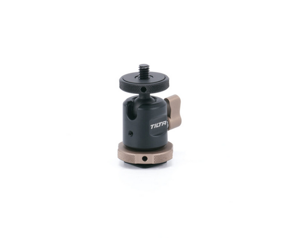 The Tilta Mini Ball Head Mount (Cold Shoe) in Black is a versatile and compact mount designed to attach external monitors, lights, and other accessories securely to camera rigs, with multiple angle adjustments and secure mounting options.