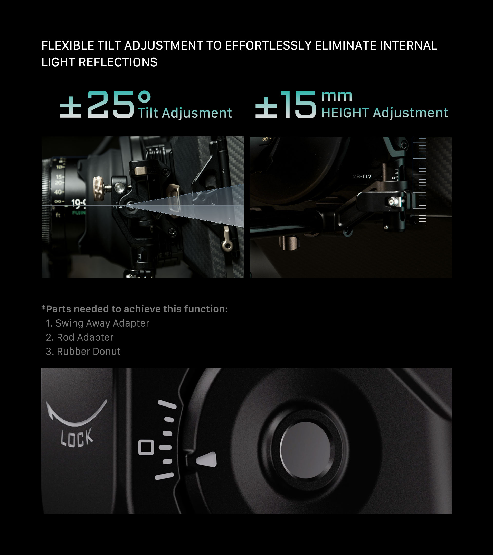 Equipped with rod adapters for 15mm LWS rods, the Mirage Pro offers easy integration into your existing setup and it can be paired with the optional swing away adapter, for easy lens changes.