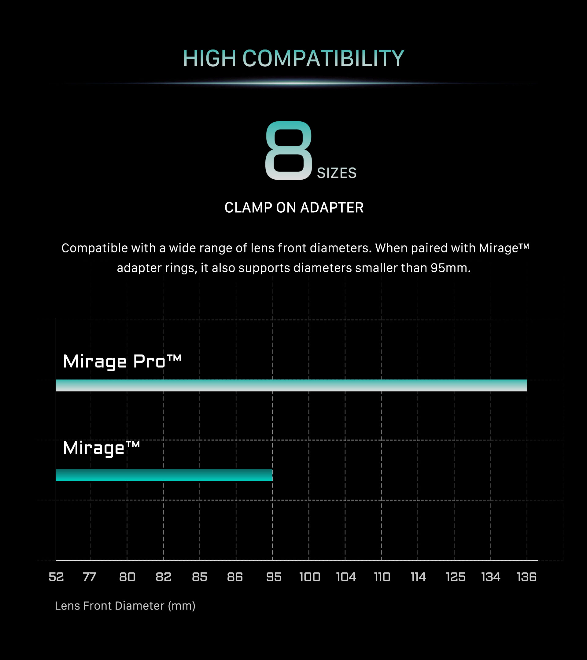 Crafted with attention to detail, the Mirage Pro is a clamp-on matte box designed to accommodate various lens sizes, supporting lenses with outer diameters of 95mm, 110mm, 114mm and 134mm as well as photography lenses with the following filter thread adapters: 67mm, 72mm, 77mm, 82mm.