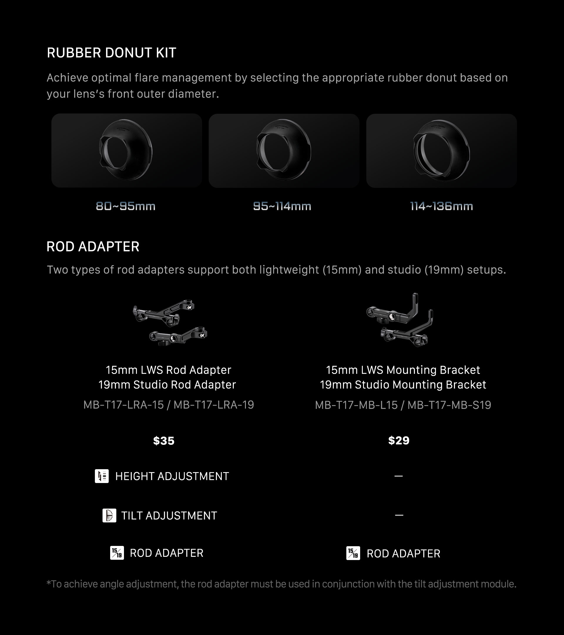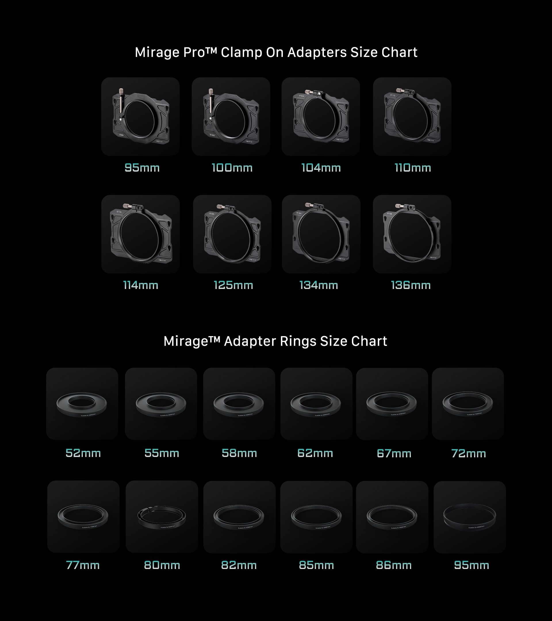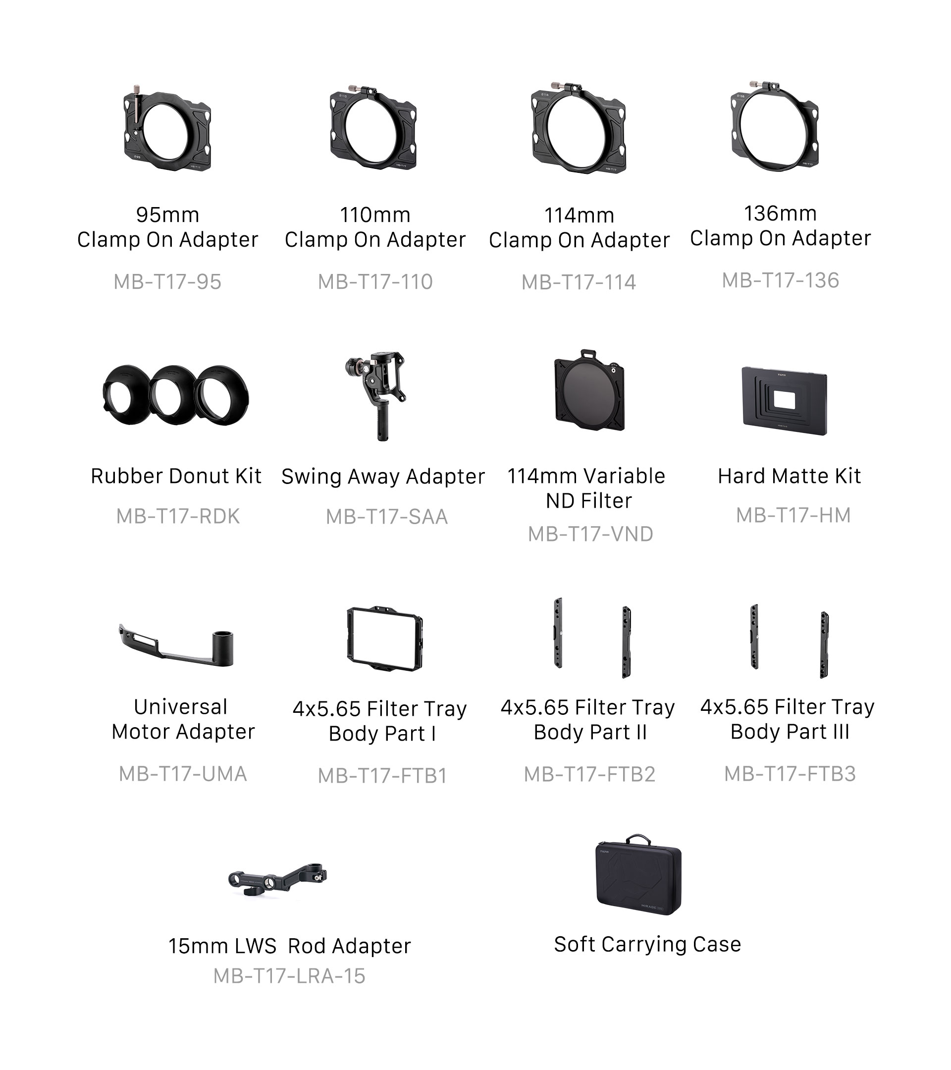 1:Clamp On Adapters for Tilta Mirage Pro Matte Box (95mm、110mm、114mm、136mm)*1 Set