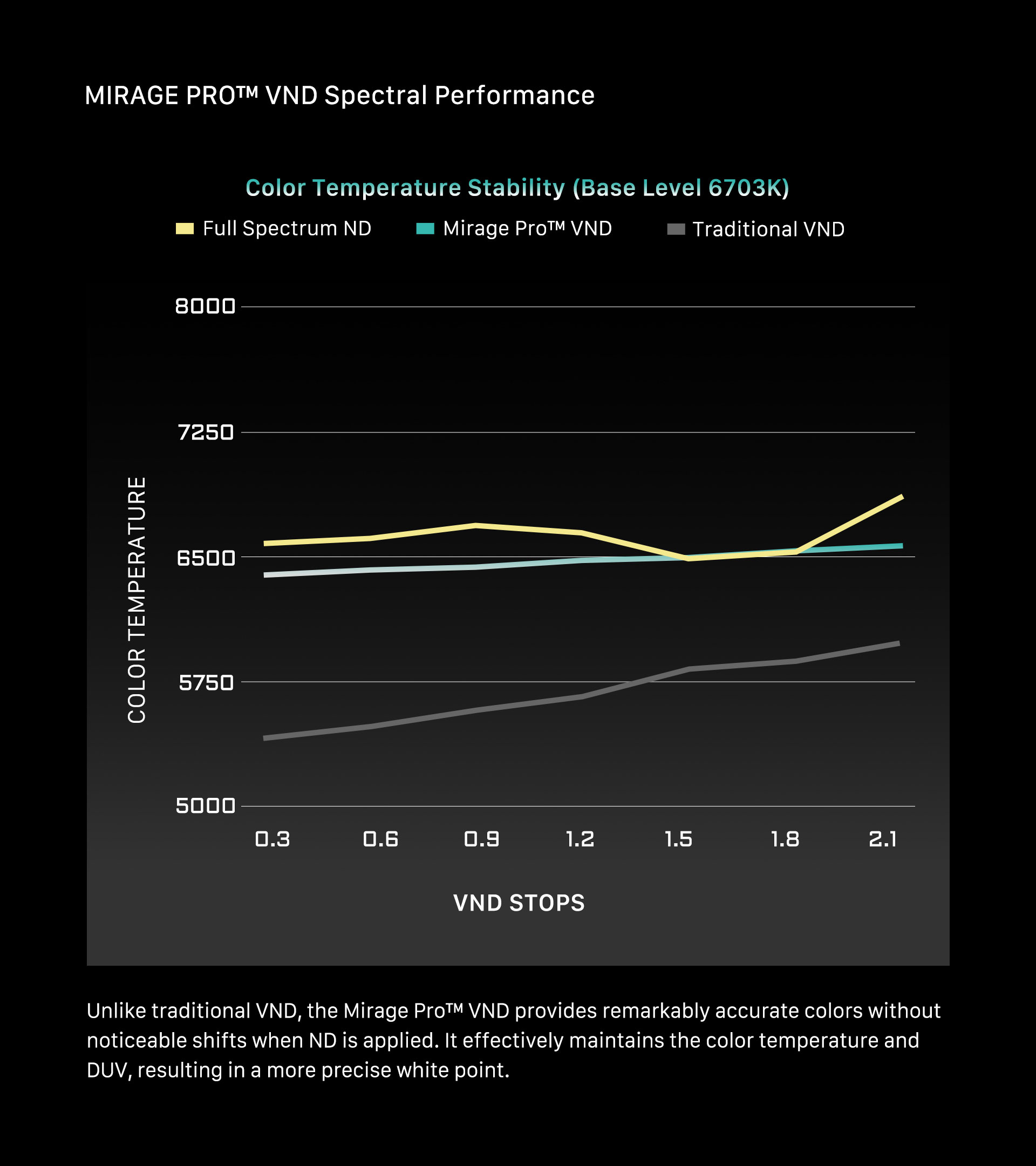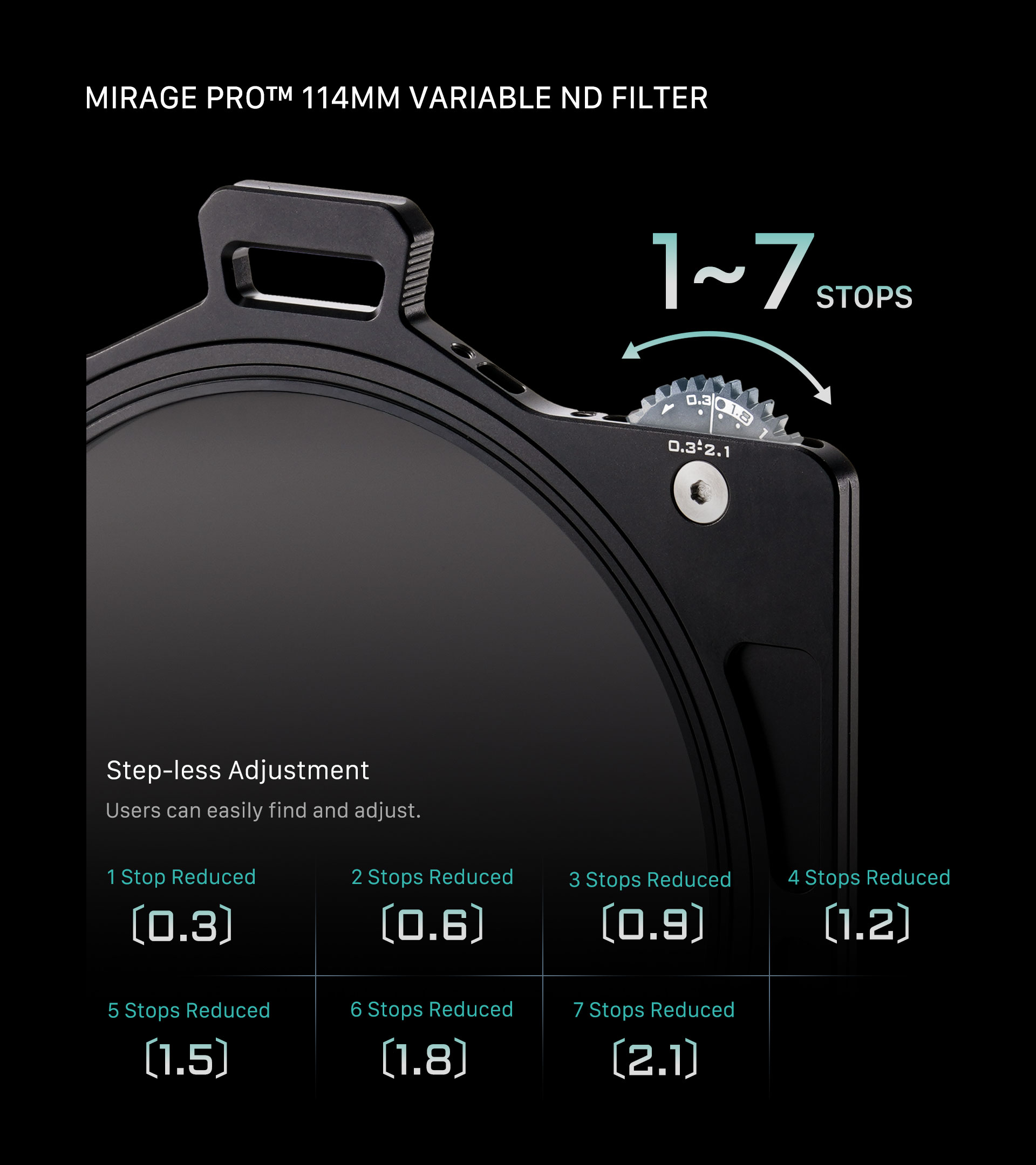 The VND Kit includes a 114mm Variable ND Filter that reduces 1 to 7 stops of light. This allows users to control exposure with ease and precision.