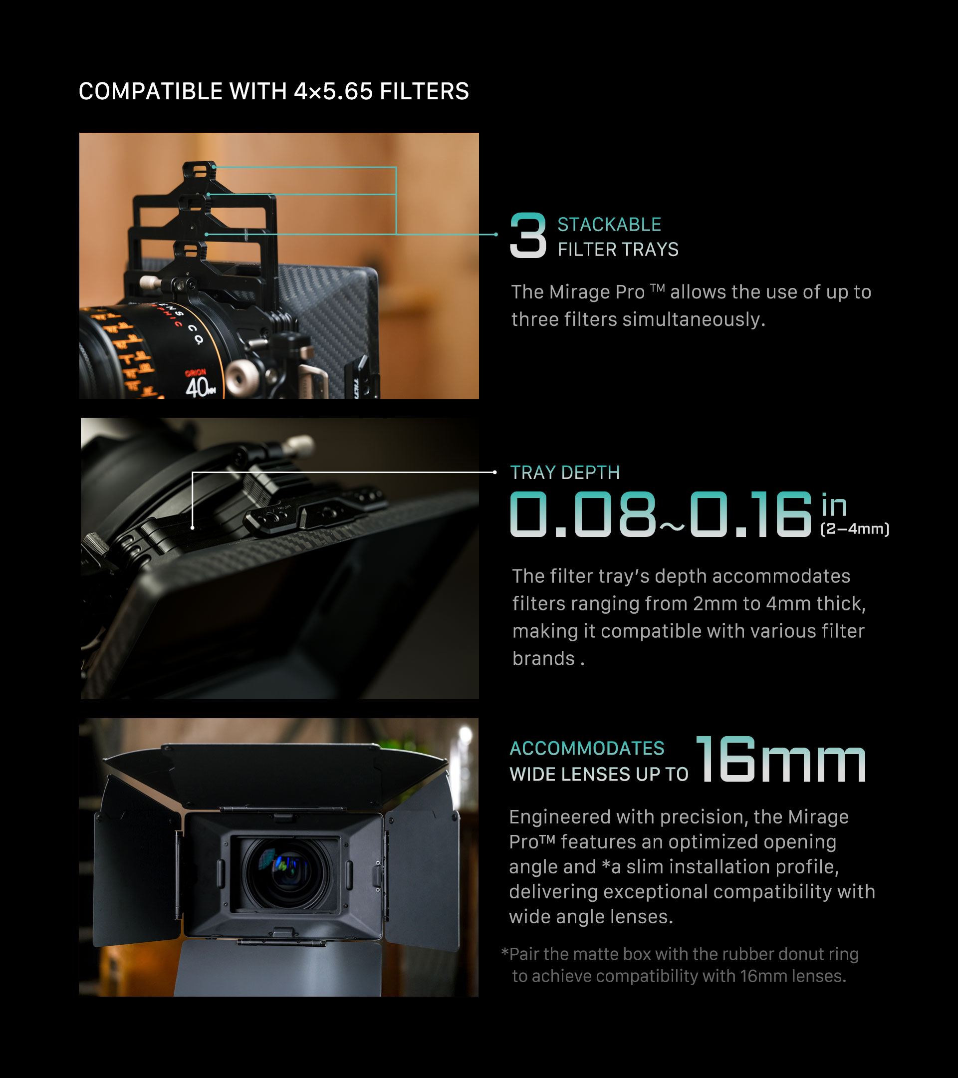 Crafted with attention to detail, the Mirage Pro is a clamp-on matte box designed to accommodate various lens sizes, supporting lenses with outer diameters of 95mm, 110mm, 114mm and 134mm as well as photography lenses with the following filter thread adapters: 67mm, 72mm, 77mm, 82mm.