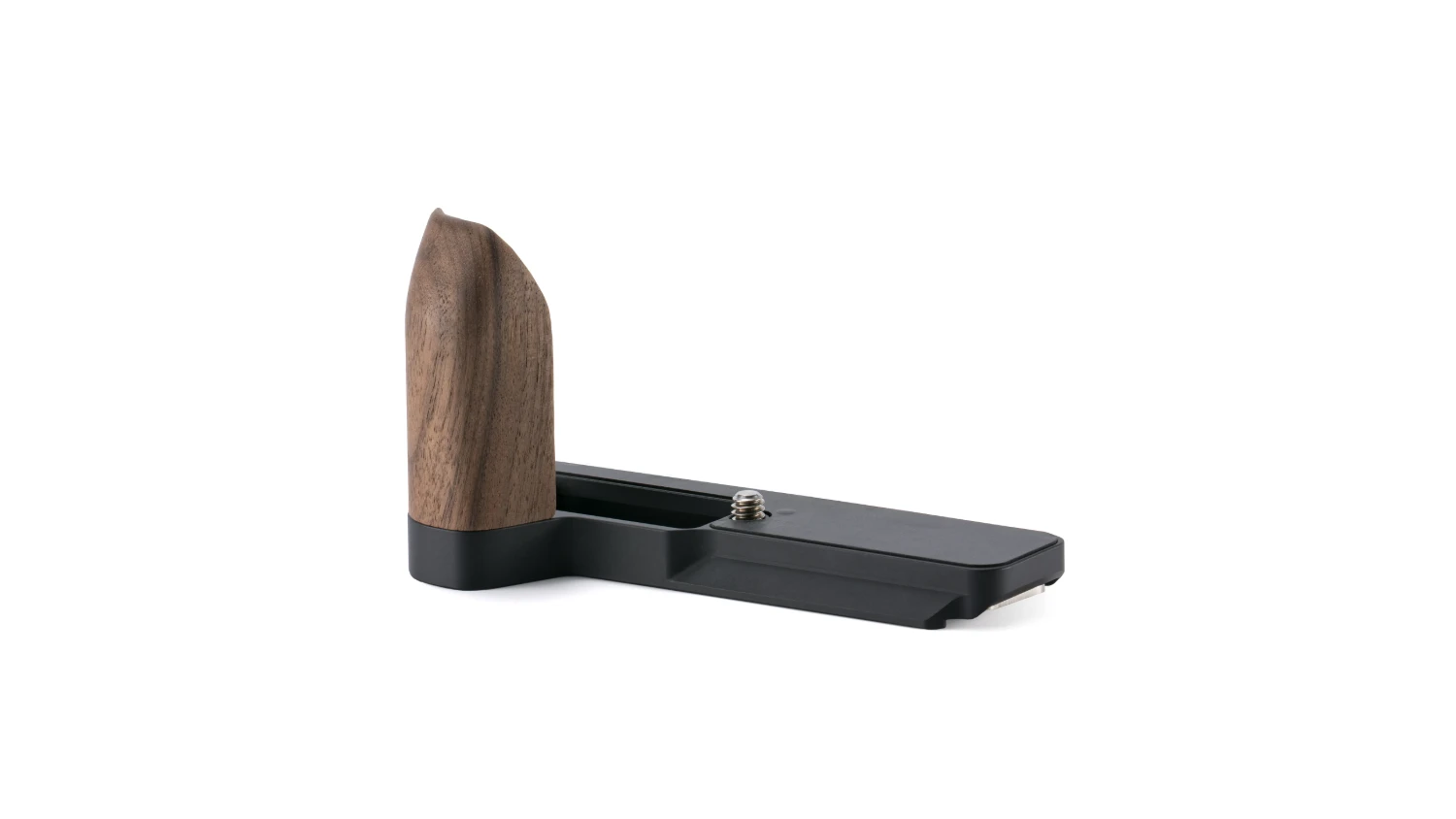 Introducing the Mounting Baseplate with Wooden Grip for the Canon PowerShot V1. The foundation of this L-Bracket shaped accessory is a Wooden Handgrip, crafted from Walnut Wood. This provides a more comfortable way to operate and handle the camera while still remaining compact and travel friendly.
