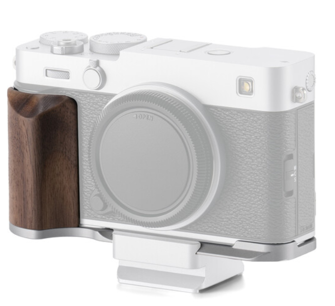 The Tilta TA-T91-WG-S elevates the FUJIFILM X-E5 into a beautifully balanced, pleasure-to-hold camera with a premium silver anodized aluminum L-bracket and genuine walnut wood side grip that feels like a natural extension of the body. The ergonomic wooden handle dramatically improves one-handed stability and comfort for street, travel, and documentary work, while the precisely machined bottom plate is fully compatible with any standard Arca-Swiss quick-release plate (sold separately) for instant mounting on gimbals, lightweight tripods, or clamps. Despite adding professional handling, the open design leaves the battery compartment, memory-card slot, and every button completely accessible. At only 599 g, this silver-and-walnut kit perfectly complements the X-E5’s timeless rangefinder look while delivering modern rigging performance.