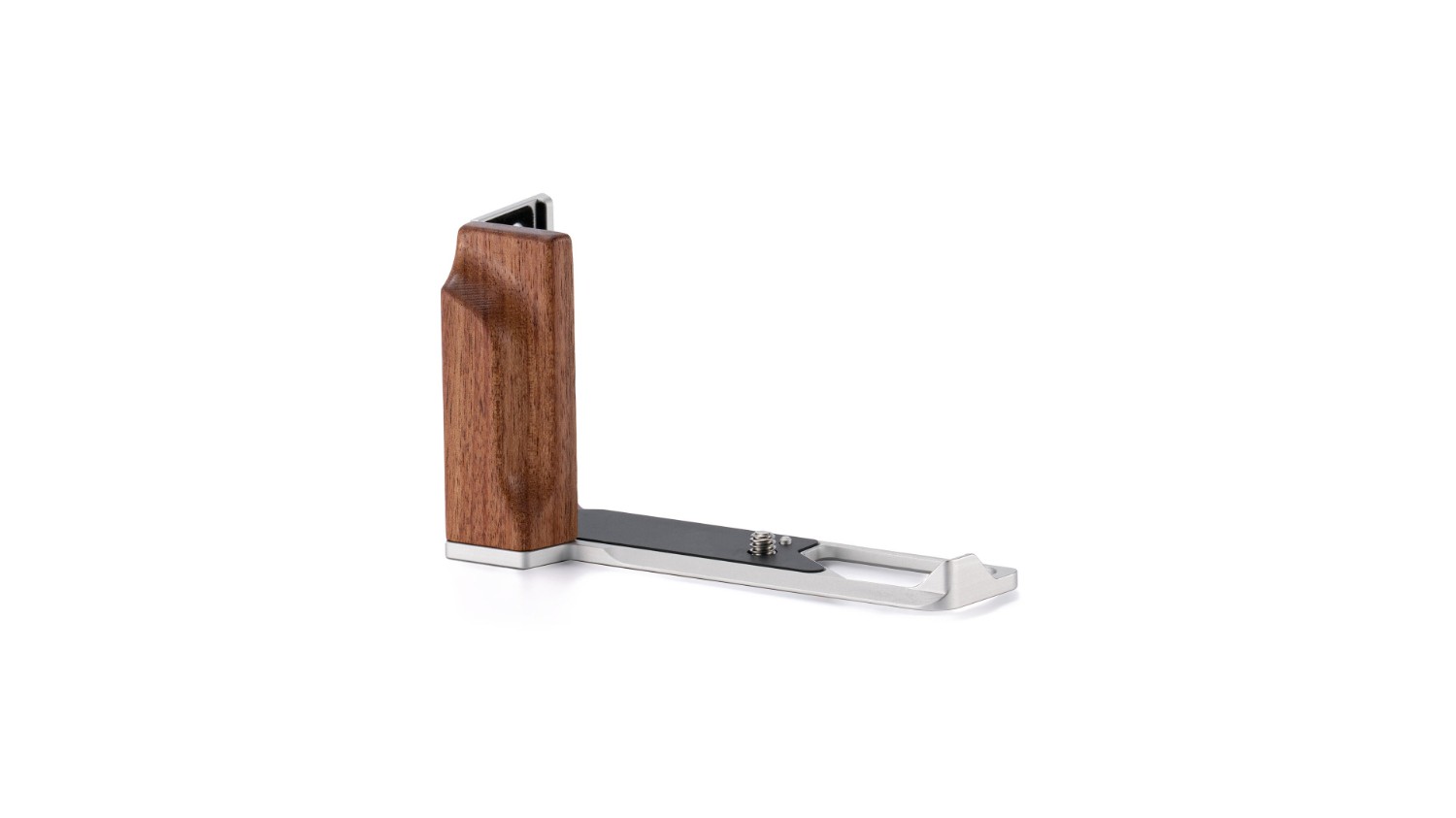 Introducing the Mounting Baseplate with Wooden Grip for the Sigma BF. The foundation of this L-Bracket shaped accessory is a Wooden Handgrip, crafted from Walnut Wood. This provides a more comfortable way to operate and handle the camera while still remaining compact and travel friendly.