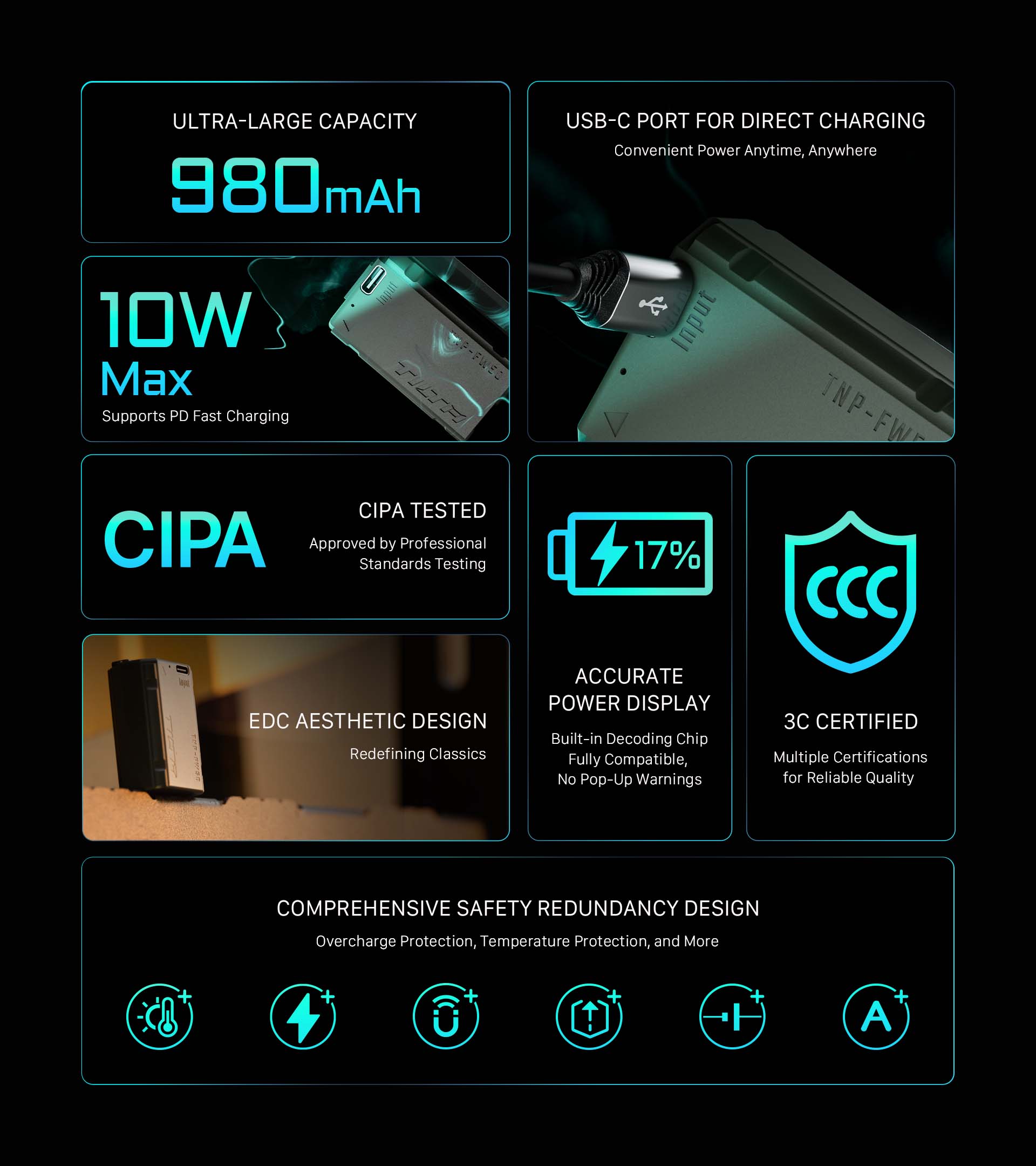 Featuring an innovative high-energy-density battery cell, this battery delivers extended endurance, making it ideal for both photo and video sessions.