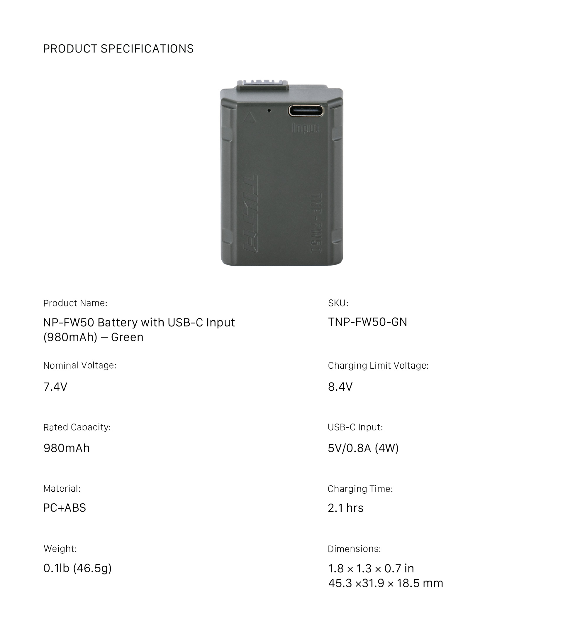 Whether you’re a professional or an enthusiast, the NP-FW50 is a smart, efficient, and safe power solution for all your photography and videography needs.