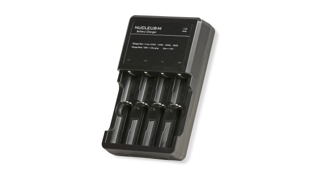 This smart charger can charge one to four IMR/Li-ion batteries simultaneously via wall AC power, 12V car power, or 5V USB power. It comes with the Nucleus-M kit and is used to charge the 18650 batteries that are required to power the Nucleus-M?s hand unit and handles. Aside from 18650 batteries, the charger can also charge 26650, 22650, 18490, 17670, 17500, 10400, 16340, 14500, 18350, (RCR123) and Ni-MH/Ni-Cd: AA, AAA, AAAA, C batteries. Above each battery compartment are LED indicators. The LEDs indicate the amount of charge: a solid blue LED bar over the battery indicates a full charge while a red LED indicate a still charging battery. The battery slots are spring loaded for optimum fit.
