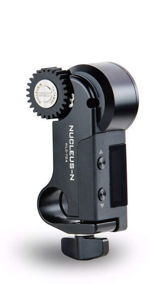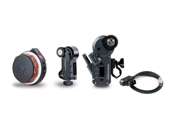 The system includes the Nucleus-Nano wireless focus handwheel, which communicates with the motor via 2.4 GHz wireless signal and provides responsive, lag-free control from long distances. The handwheel features programmable A/B hard stops, run/stop functionality, and an ergonomic design with a rosewood-lined grip. Multiple adapters allow the handwheel to mount directly onto popular gimbals such as the DJI Ronin-S, Tilta Gravity G2X, and Zhiyun Crane.