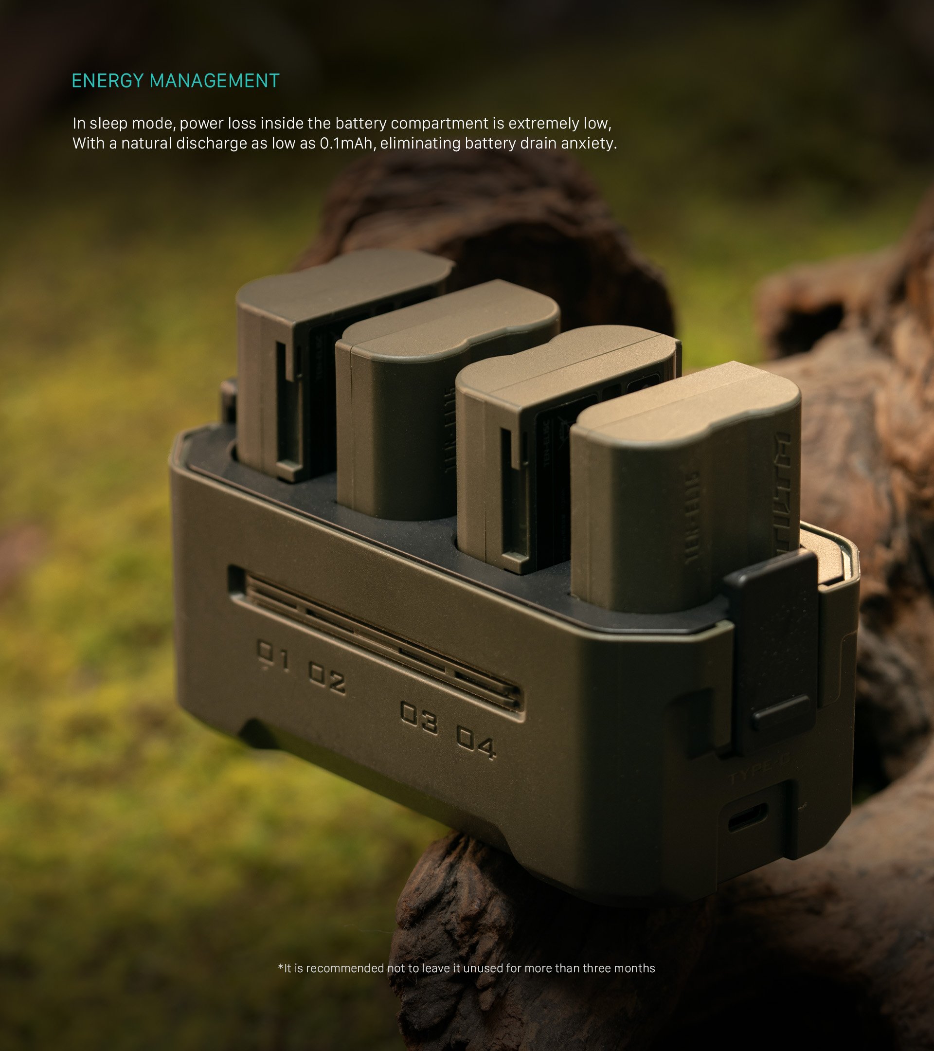 This compact charging station is designed to support Nikon and third-party EN-EL15C batteries, offering four slots for easy charging and convenient storage.