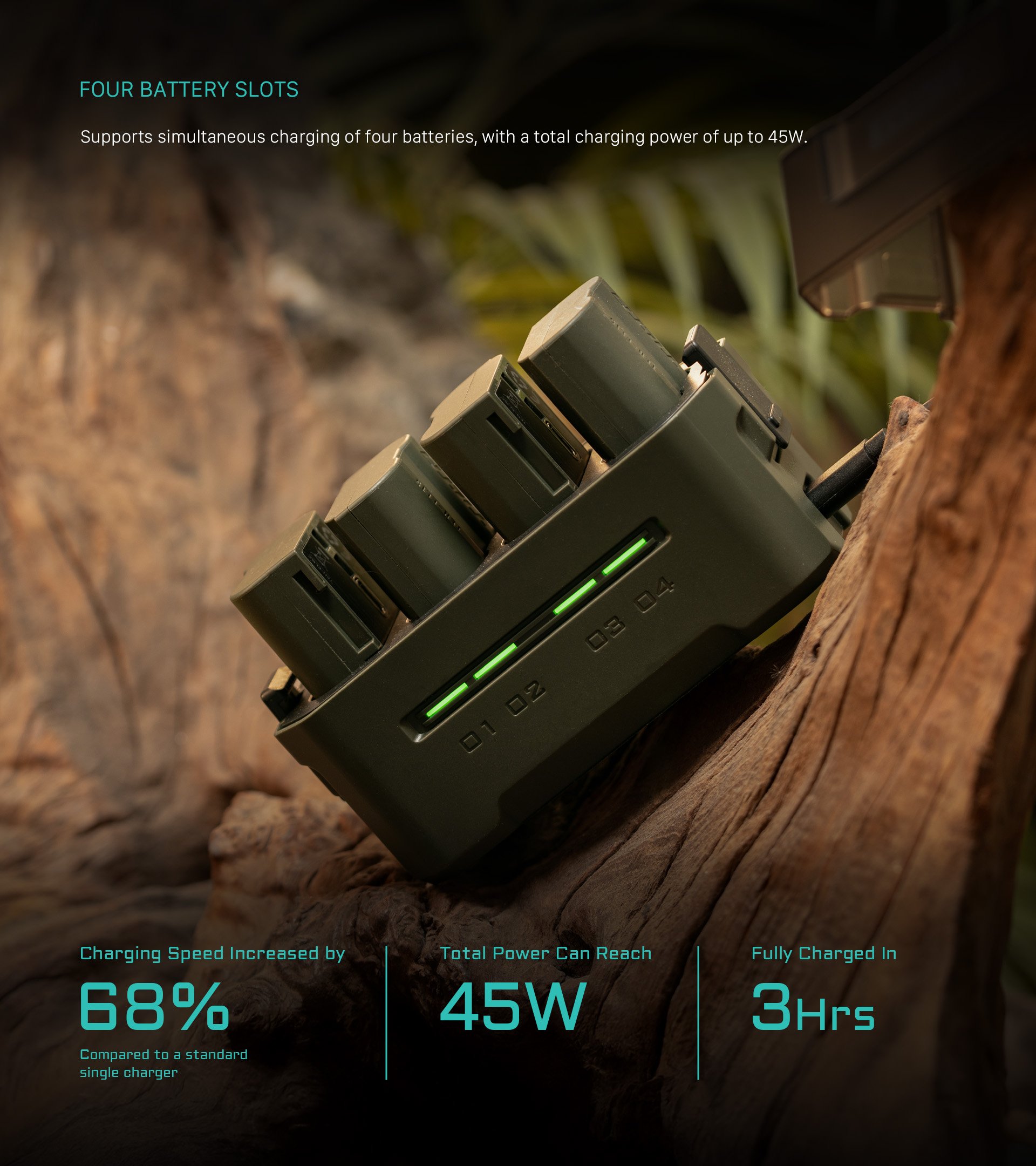This compact charging station is designed to support Nikon and third-party EN-EL15C batteries, offering four slots for easy charging and convenient storage. Equipped with 45W PD Fast Charging, it delivers an impressive 68% faster charging speed than a standard single charger, ensuring your batteries are ready for action in just 3 hours.