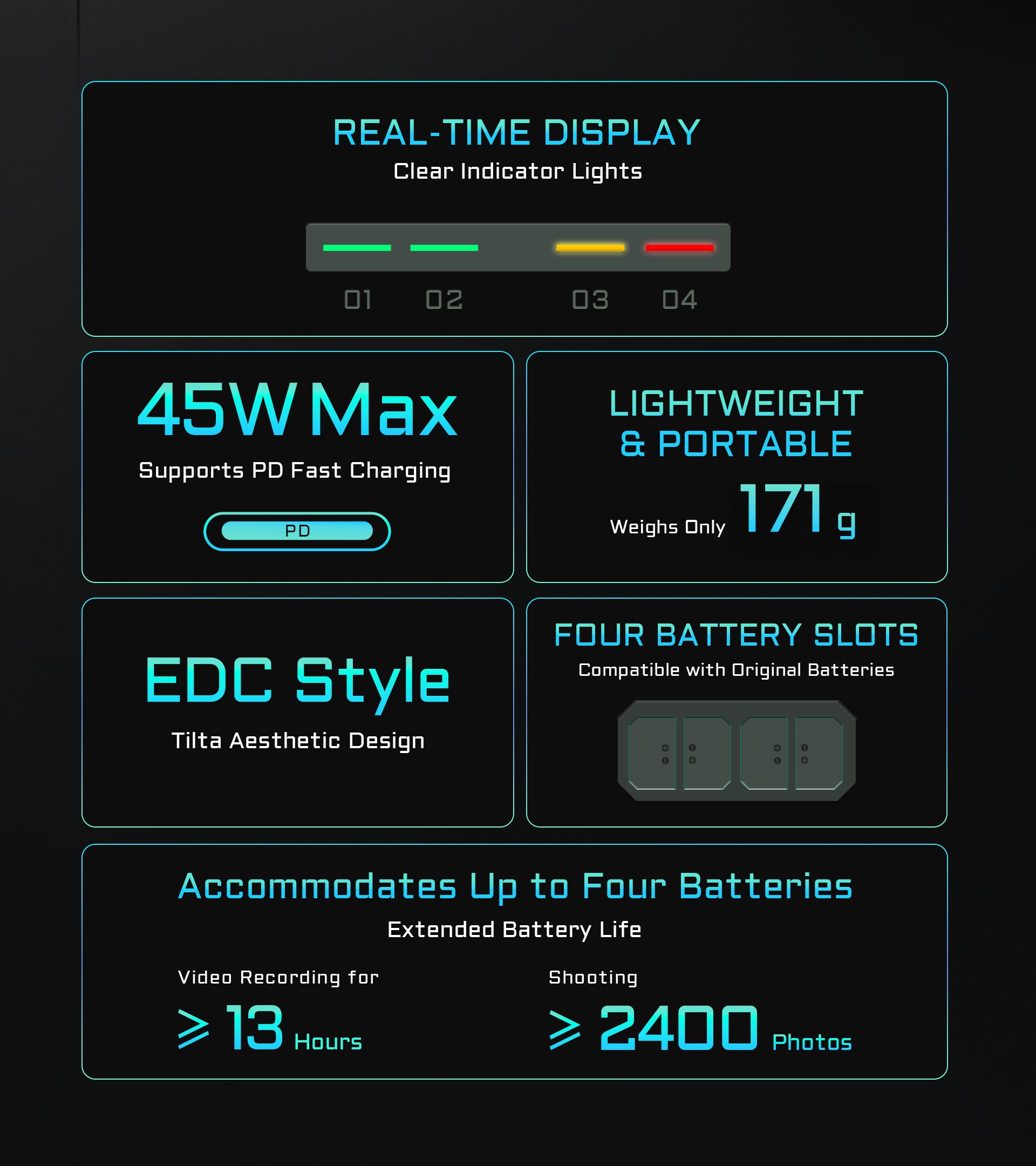 Real-time charging status indicators keep you informed on the status of each battery and the lightweight design means the unit weighs only 176 grams, ensuring it is easy to travel with.