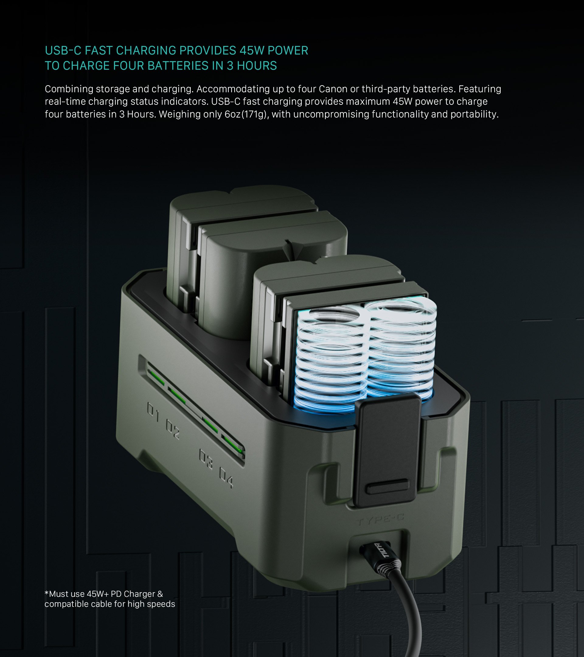 This compact charging station is designed to support Canon and third-party LP-E6 batteries, offering four slots for easy charging and convenient storage. Equipped with 45W PD Fast Charging, it delivers an impressive 68% faster charging speed than a standard single charger, ensuring your batteries are ready for action in just 3 hours.
