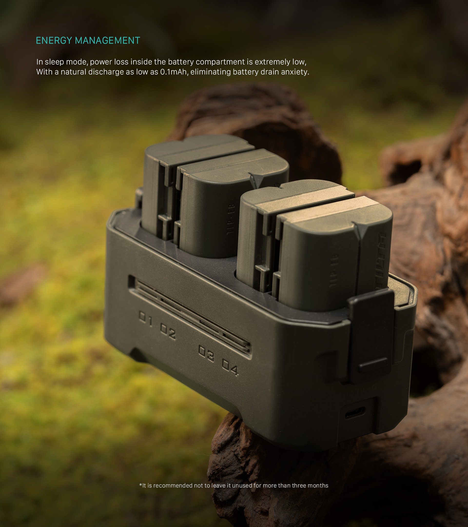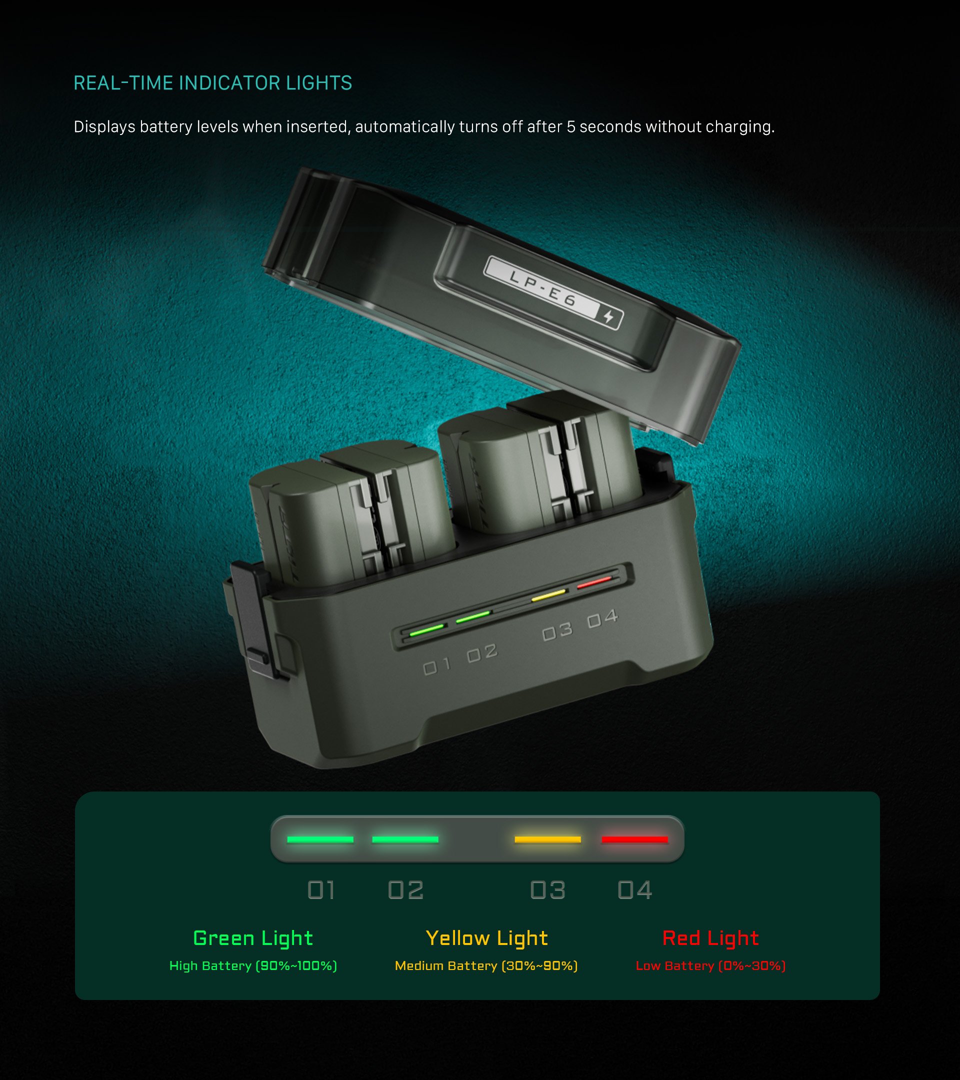 This compact charging station is designed to support Canon and third-party LP-E6 batteries, offering four slots for easy charging and convenient storage.