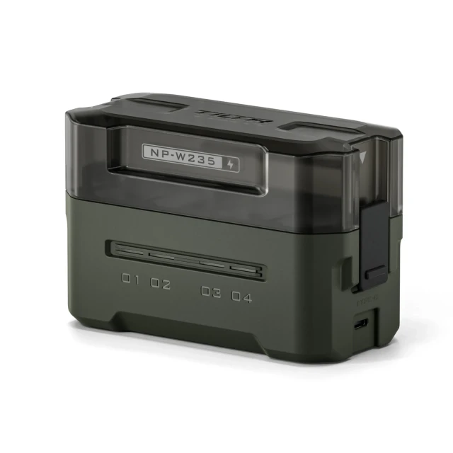 This compact charging station is designed to support Fujifilm and third-party NP-W235 batteries, offering four slots for easy charging and convenient storage.