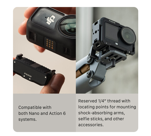 The Tilta Quick Release Mounting Baseplate for DJI Osmo Action 6 & Nano provides a fast, secure, and lightweight mounting solution for creators who need speed and flexibility in dynamic shooting environments. Custom designed specifically for the DJI Osmo Action 6 and Nano, this baseplate features a magnetic quick-release connection that allows the camera to be attached or removed instantly without tools.