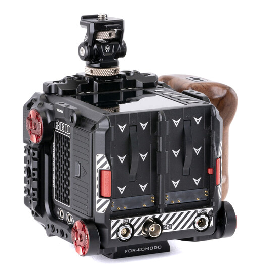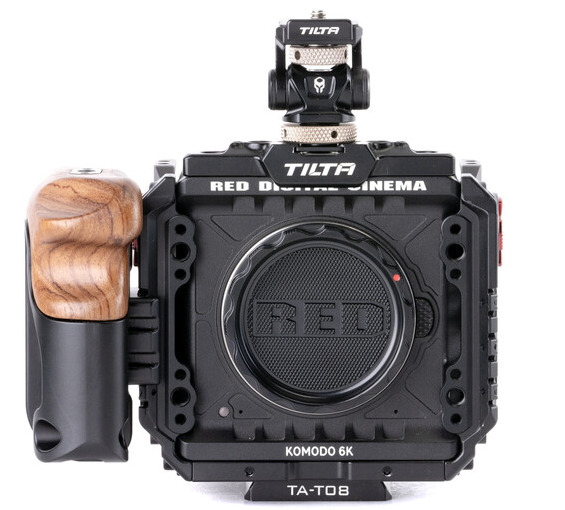 The Tilta TA-T08-A-B RED KOMODO Kit A (Black) is an essential starter rig for the RED KOMODO 6K, combining a lightweight full aluminum cage with four ARRI rosettes and extensive mounting threads, a NATO-mount right-side wooden handle for comfortable handheld operation, a tilt-adjustable cold-shoe monitor bracket and both Arca-Swiss and Manfrotto quick-release bottom plates – delivering protection, ergonomics and fast tripod/gimbal transitions in one affordable package.
