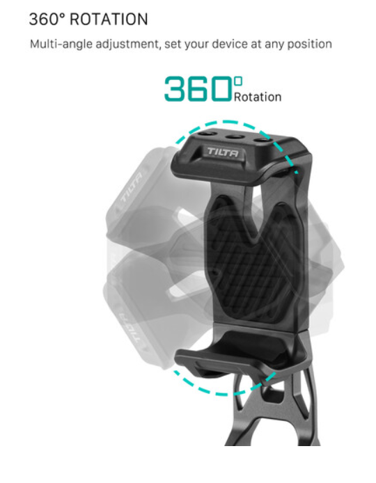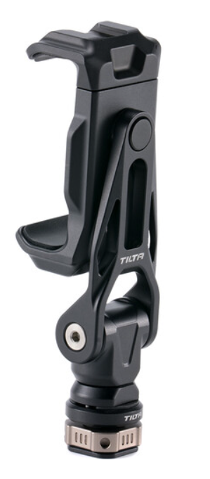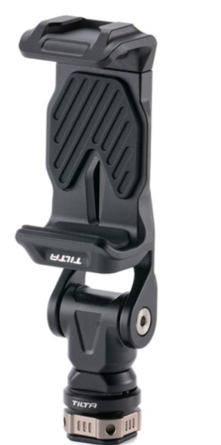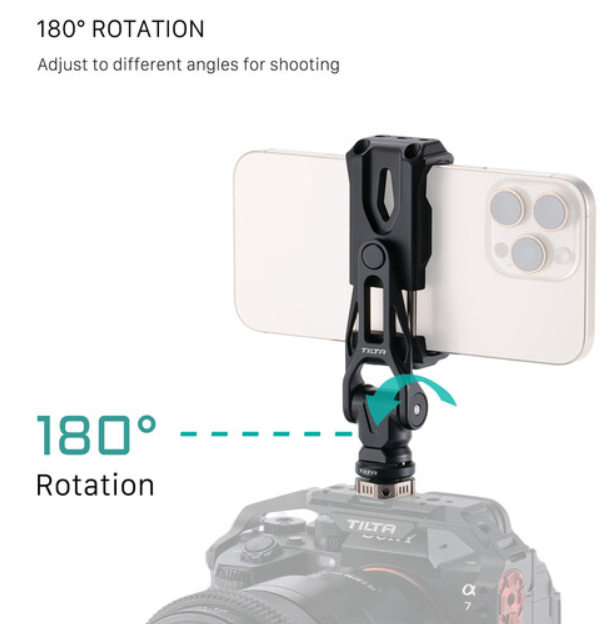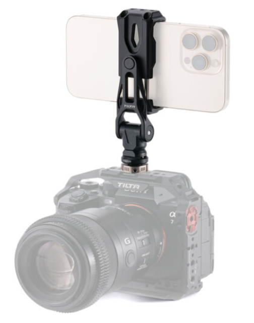 The Tilta TA-PMB5-CSK-B is a complete, ready-to-use rotatable phone mounting solution that combines the V2 360° phone clamp (fits phones 3–3.8″ wide) with an integrated cold-shoe adapter, letting you instantly slide a smartphone onto any camera hot shoe, cage cold shoe or top handle for use as a director’s monitor, framing assist, live-stream display or wireless receiver mount – all with full portrait-to-landscape rotation and rock-solid, anti-twist connection.