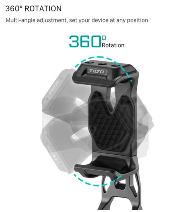 The TA-PMB5-HBK-B combines Tilta’s popular Rotatable Phone Mounting Bracket V2 with a dedicated handlebar clamp, creating one of the toughest and most flexible phone mounts for two-wheeled action. The CNC-machined aluminum clamp features silicone-padded jaws that safely grip phones from 3 to 3.8 inches wide without scratching. Full 360° rotation with positive stops lets you instantly switch between vertical and horizontal orientation. The handlebar adapter locks onto bars from ≈22–35 mm diameter using a large, easy-grip knob and dual locating pins to eliminate twist—even during aggressive off-road riding. The entire system stays modular: remove the handlebar adapter in seconds and pair the bracket with any other Tilta V2 adapter for traditional camera-rig use.