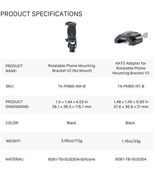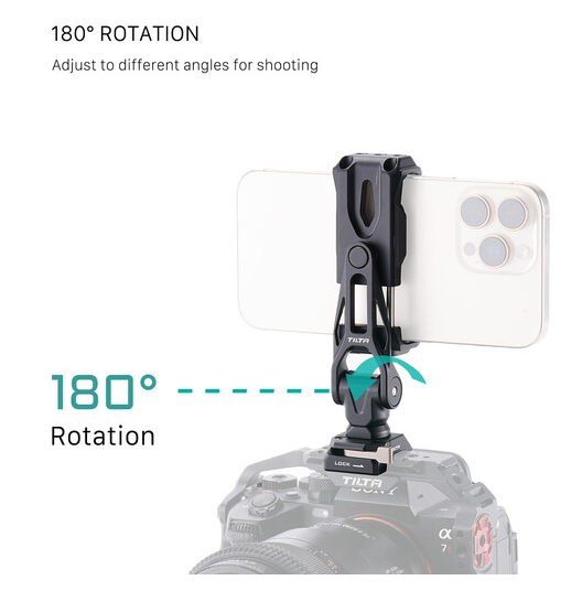 The Tilta TA-PMB5-NTK-B Rotatable Phone Mounting Bracket V2 with NATO Mount is a rock-solid, 360° rotating smartphone clamp (fits phones 3–3.8″ wide) that snaps directly onto any standard NATO rail via a secure quick-release NATO clamp with anti-twist locating pins – perfect for turning your phone into a director’s monitor, gimbal counterweight or wireless video receiver display in seconds.