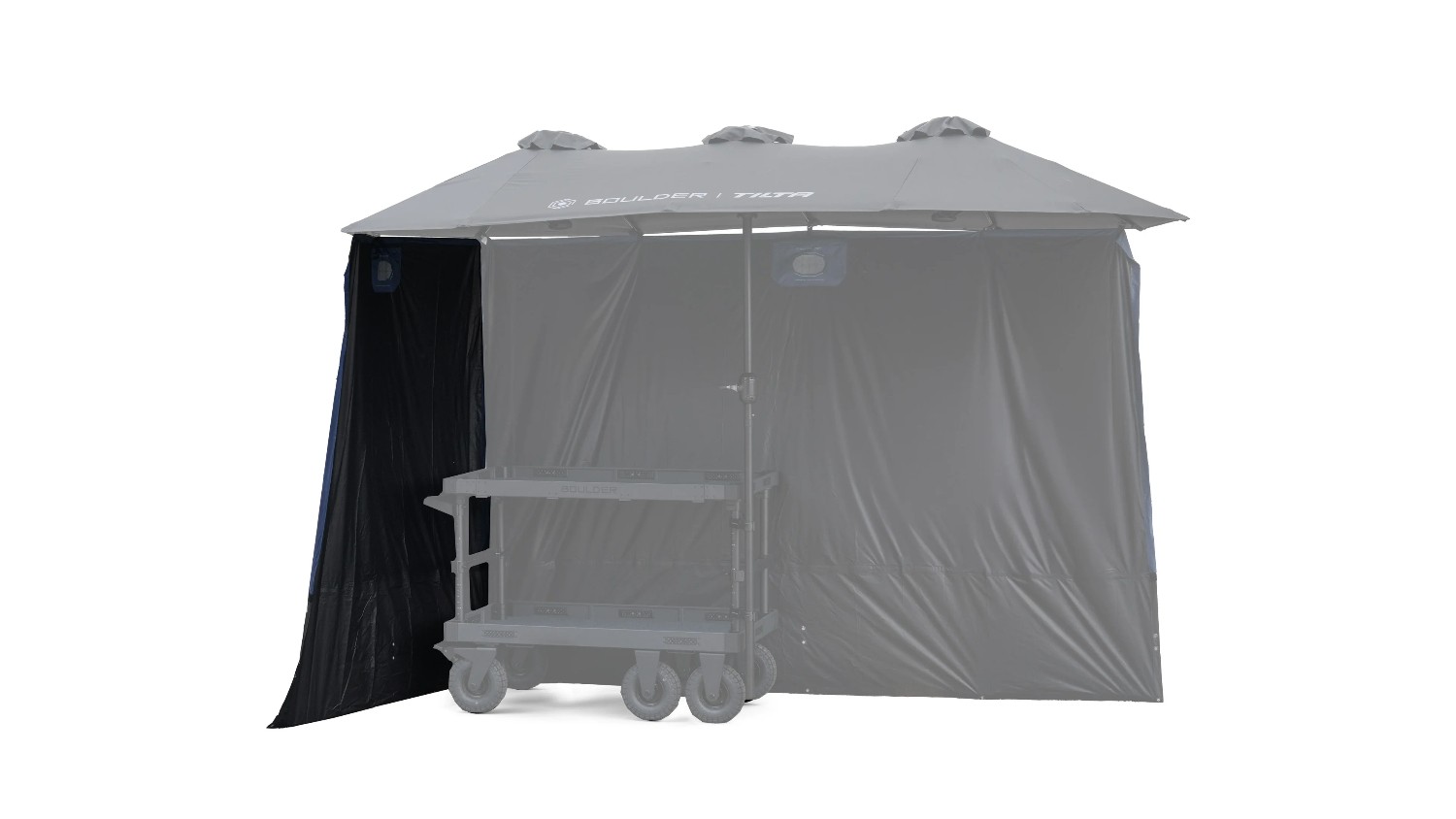 The Tilta Sunshade for Boulder Camera Cart Extended Umbrella (2 Panel) provides modular side coverage to reduce glare and reflections, helping create a controlled blackout video village environment for professional on-set monitoring.