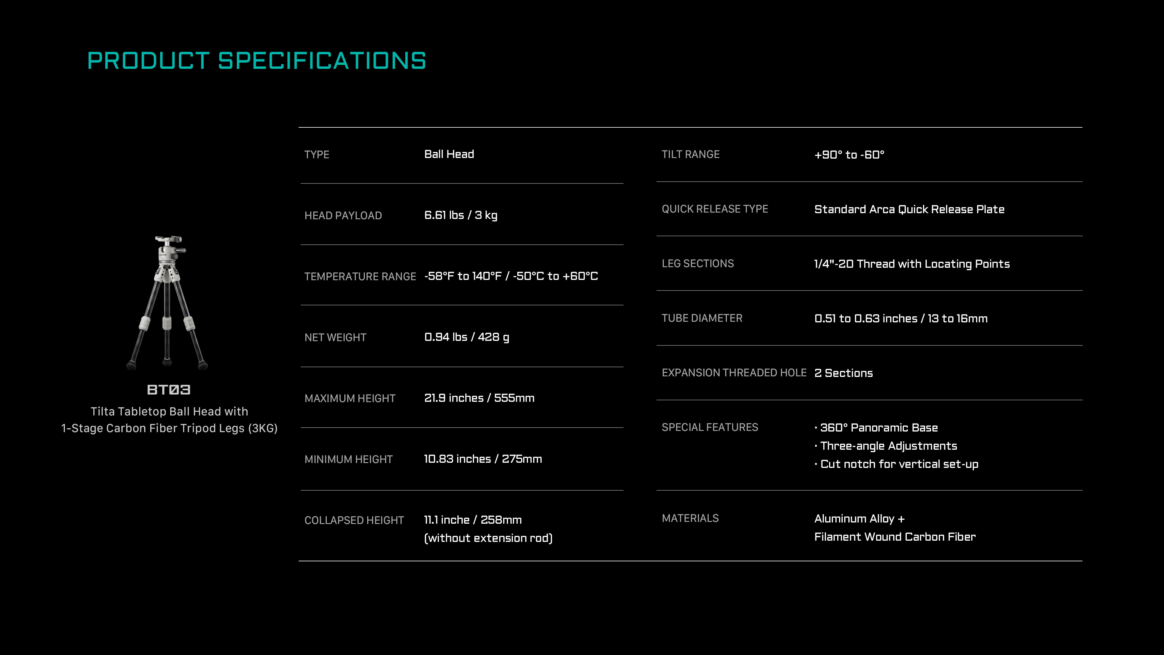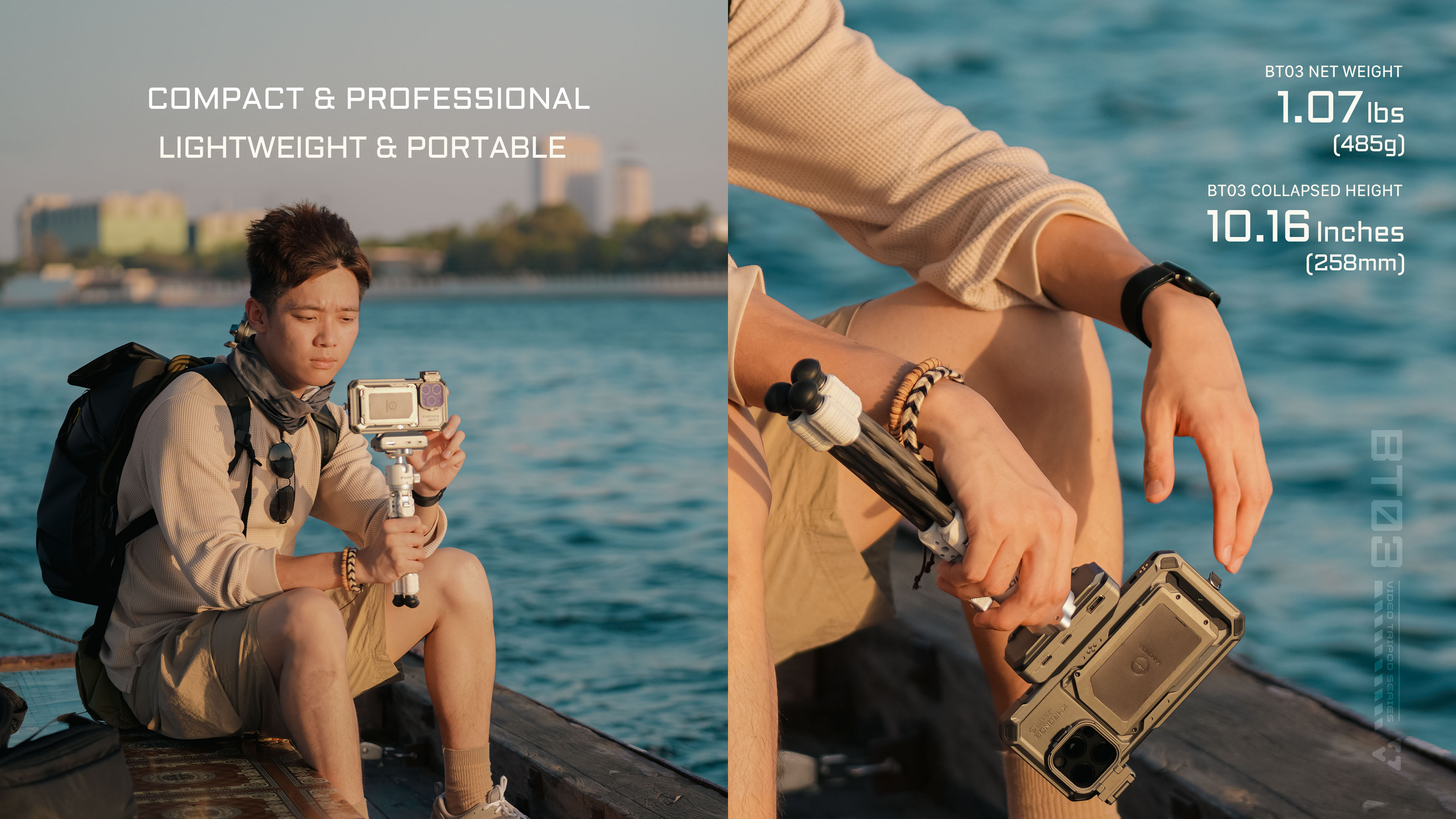 The BT03 comes equipped with a robust ball head that supports up to 6.6lbs / 3kg and includes a slot for 90° vertical shooting, allowing for seamless transitions between horizontal, vertical, and overhead configurations.