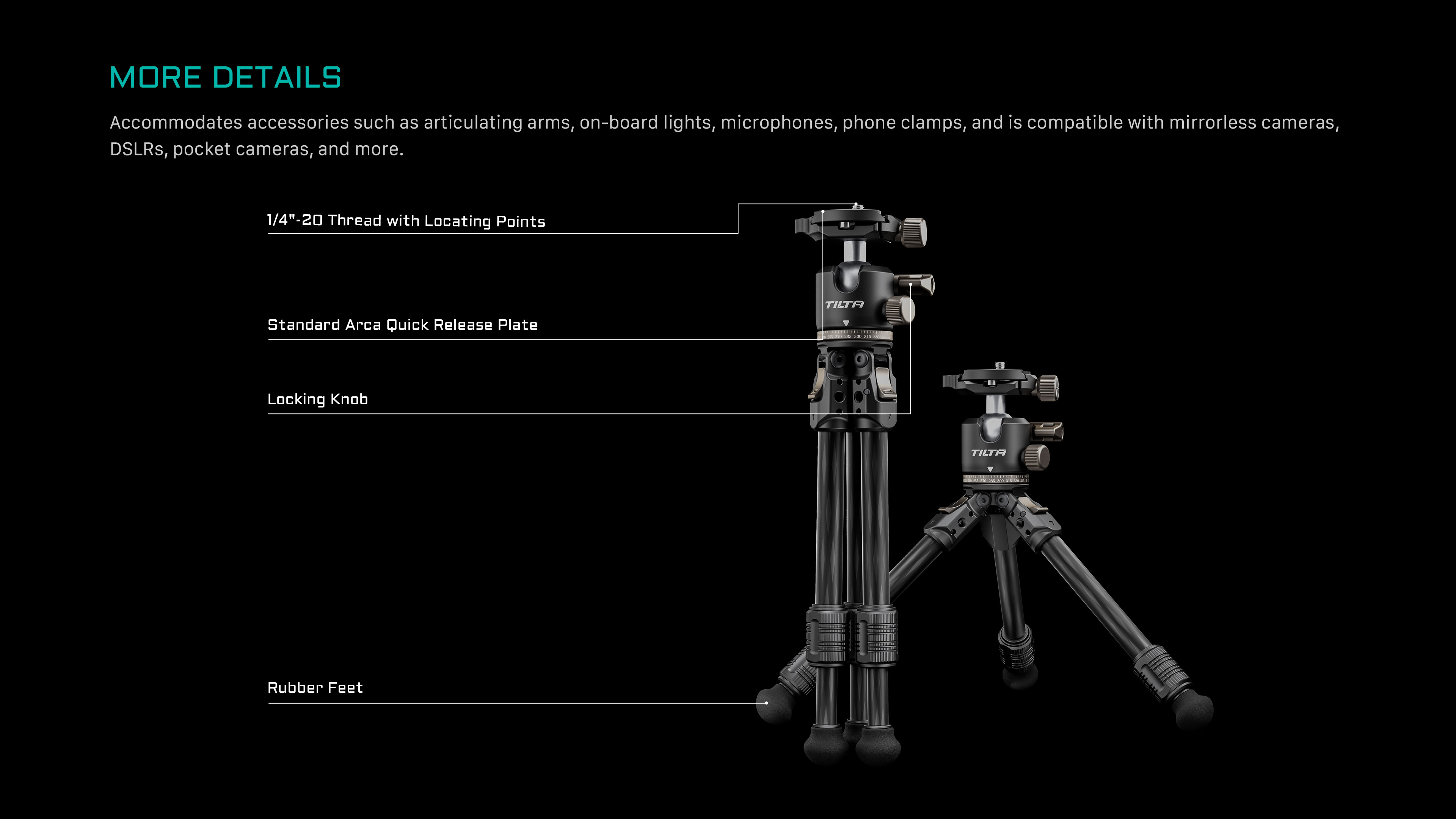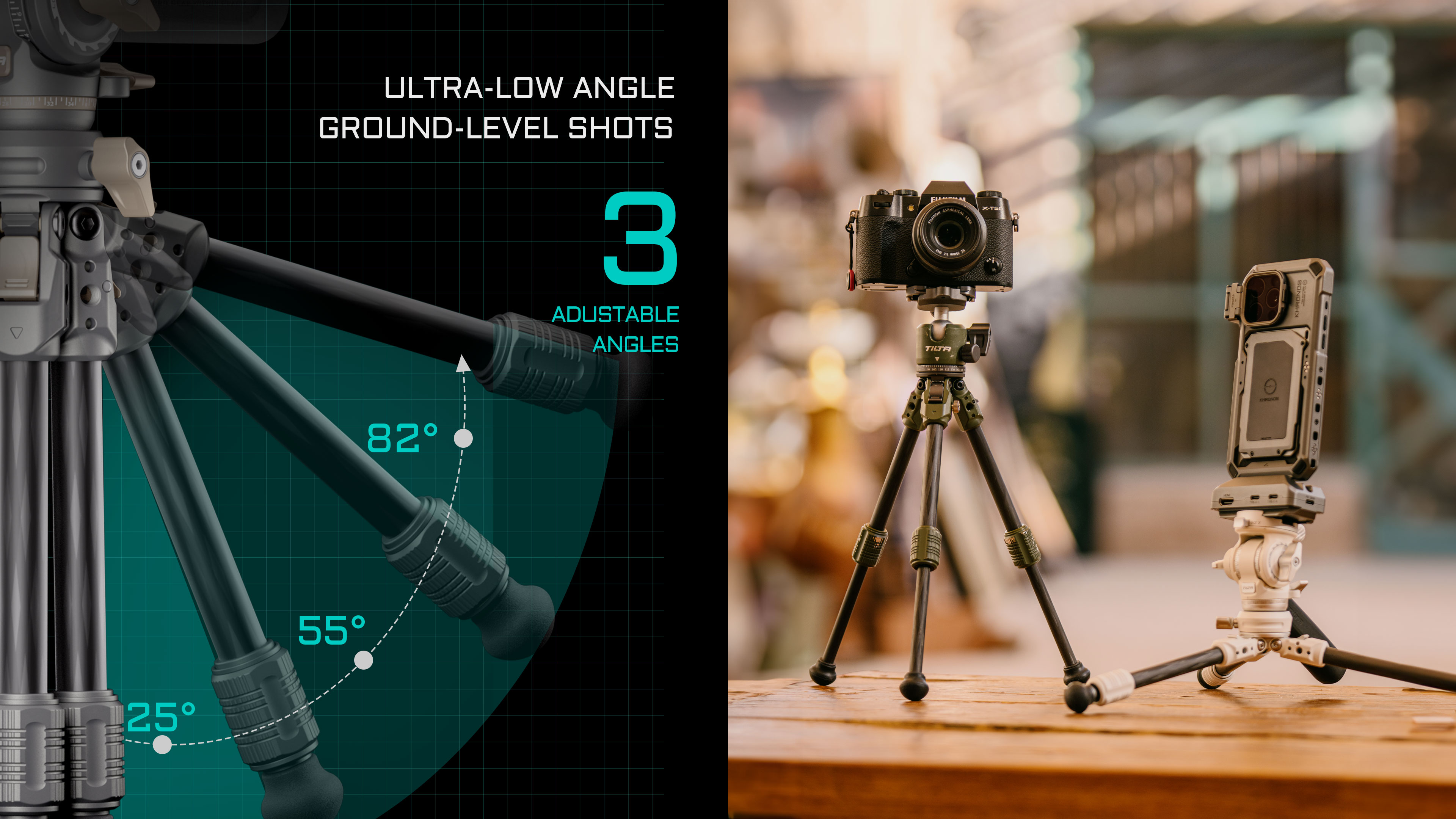 Featuring a sleek, center column-free design, this tripod excels in tight spaces and low-angle shots. The tripod’s ultra-low angle shooting capabilities are enhanced by three adjustable leg angles, enabling creative perspectives from various perspectives.