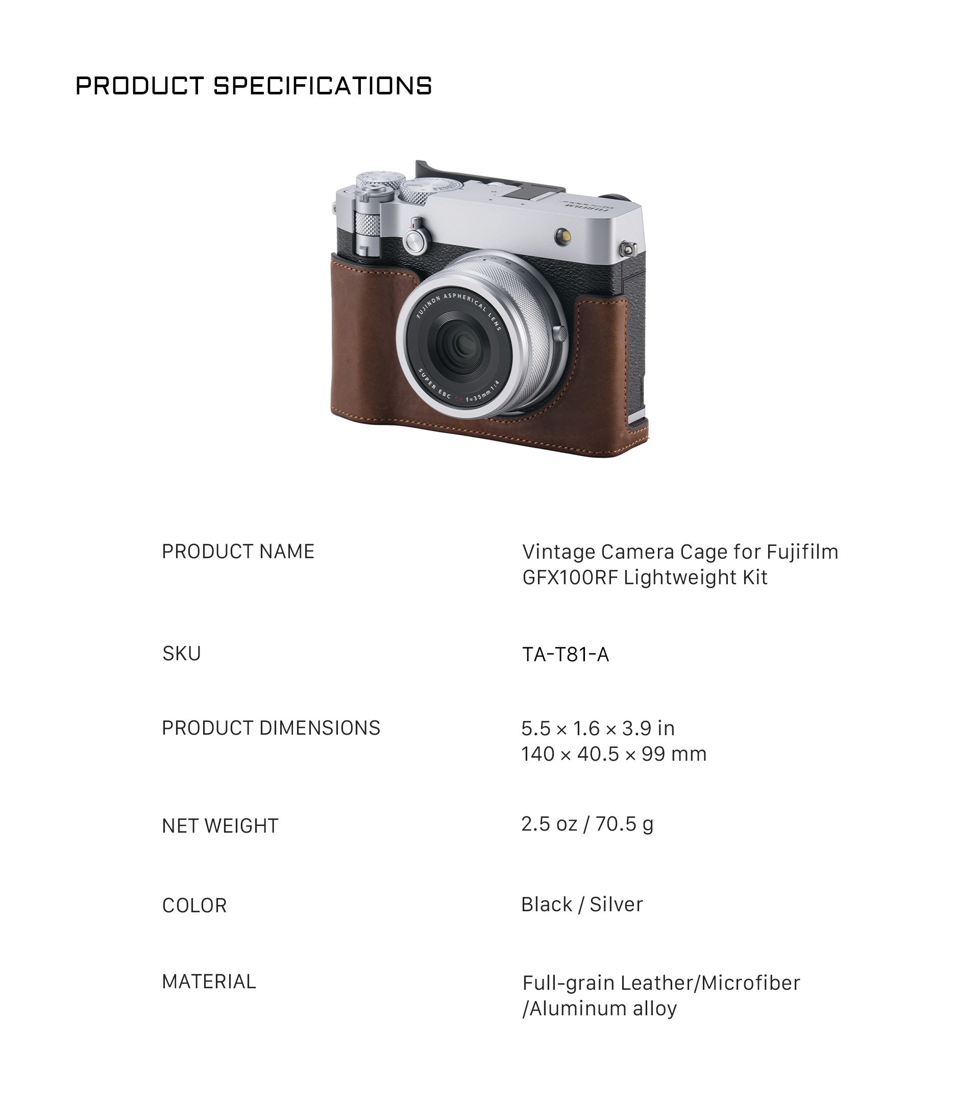 Introducing the Vintage Camera Cage for Fujifilm GFX100RF Lightweight Kit. This kit includes a Leather Camera Case for Fujifilm GFX100RF, which mounts via a 1/4″-20 screw and provides a more comfortable way for users to operate and handle the camera body via the integrated hand grip.