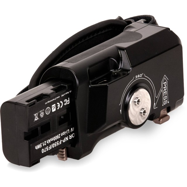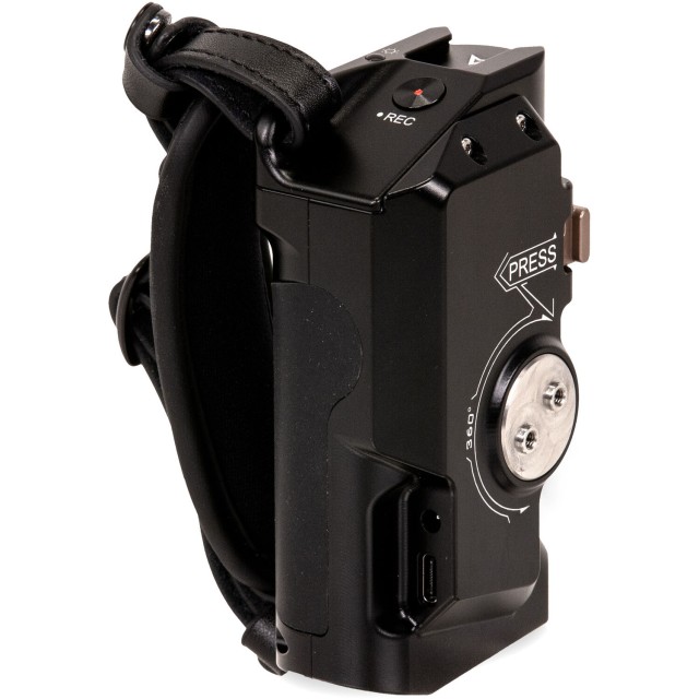 The Tilta Left-Side Advanced Power Handle, in black, attaches to the left side of Tiltaing camera cages using your choice of an optional rail/rosette mounting bracket—Tilta Left-Side Adapter Type IV, V, or VI. The handle accepts a Sony F570 battery (sold separately) and features two power outputs for running accessories off the battery. It offers an 8V USB Type-C output port and 12 VDC port. In addition to this, the Advanced Power Handle provides a run/stop button for controlling record start/stop on compatible cameras over an optional R/S cable connection.