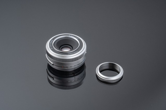 Additionally, the package includes a miniature silver lens hood, a small metal component that also serves to protect the front element of the lens, similar to the Fujinon XF 27mm.