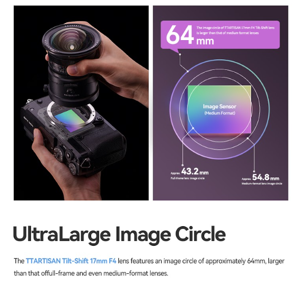 The TTArtisan Tilt Shift 17mm f/4 Z lens is a manual focus ultra-wide-angle lens designed for full-frame Z-mount cameras. Featuring tilt adjustment up to 8°, a 104° angle of view, and a complex 17-element optical design, it is ideal for architecture, landscape, and creative perspective control photography.