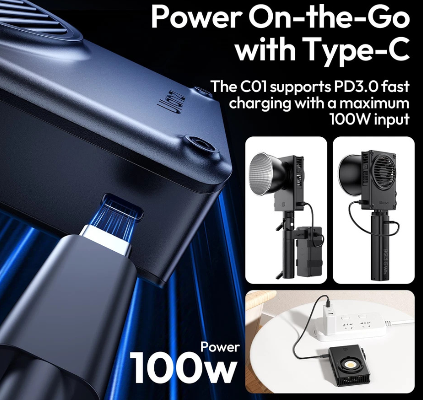 Fine-tune brightness from 0–100% and adjust the color temperature between 2700K and 6500K for versatile lighting moods. With a CRI of 96+ and TLCI ≥98, your shots capture vibrant, true-to-life colors every time. The C01 supports USB Type-C PD3.0 input (up to 100W) for flexible power options, allowing you to use power banks, V-mount batteries, or other portable sources.